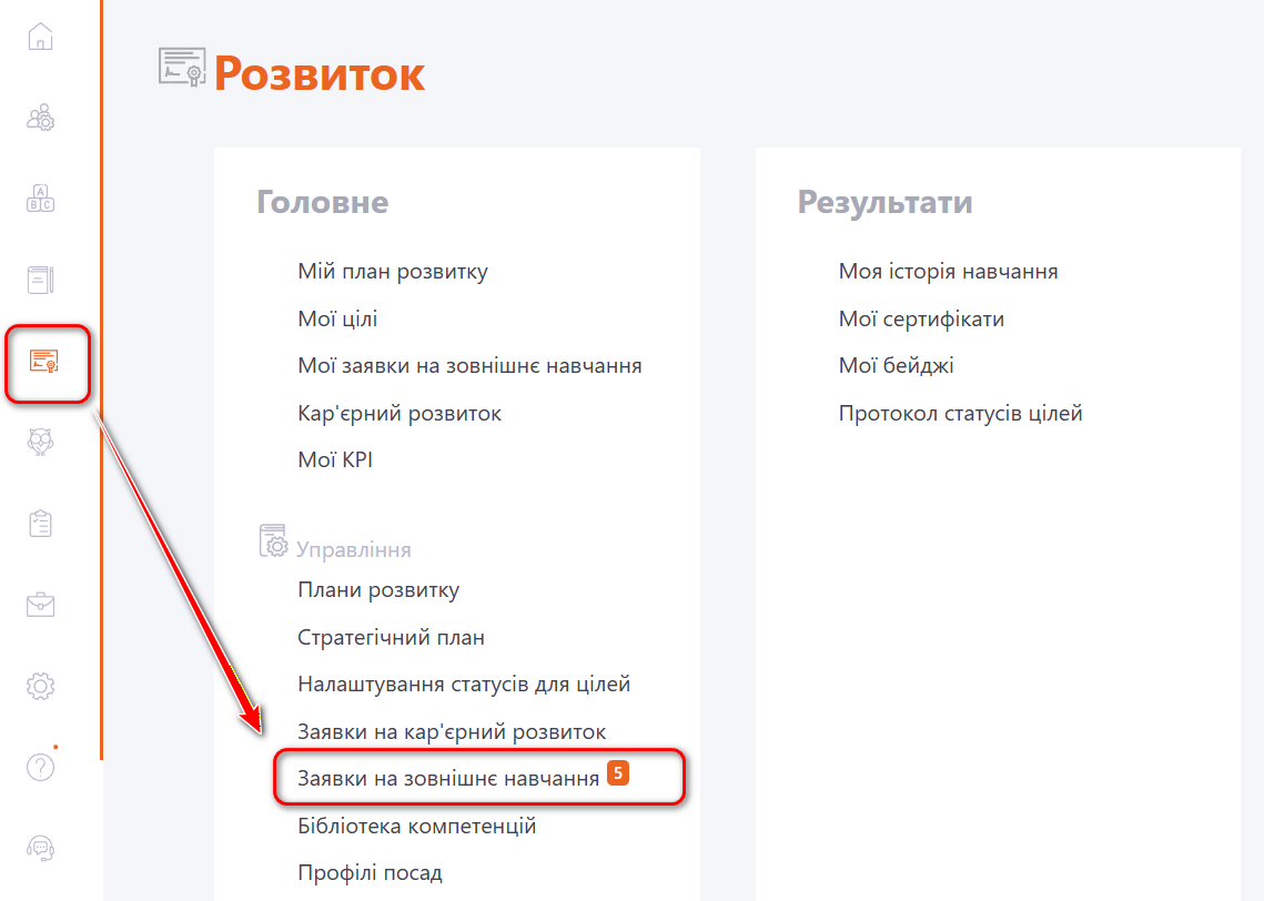 Для опрацювання заявок необхідно перейти до меню Розвиток - Управління - Заявки на зовнішнє навчання.