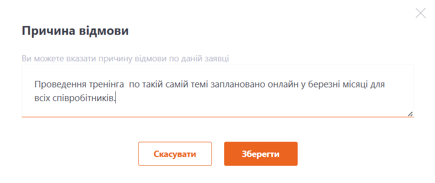 У випадку відхилення заявки керівником або адміністратором, тобто зміни статусу на Відмовлено, з'явиться модальне вікно для внесення Причини відмови.