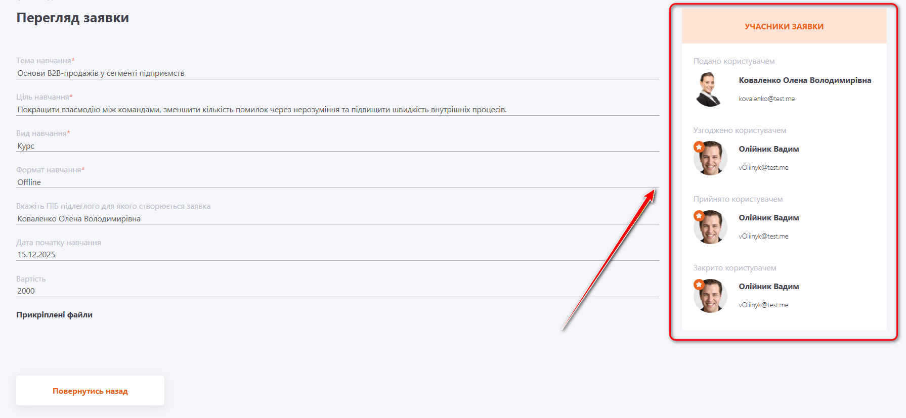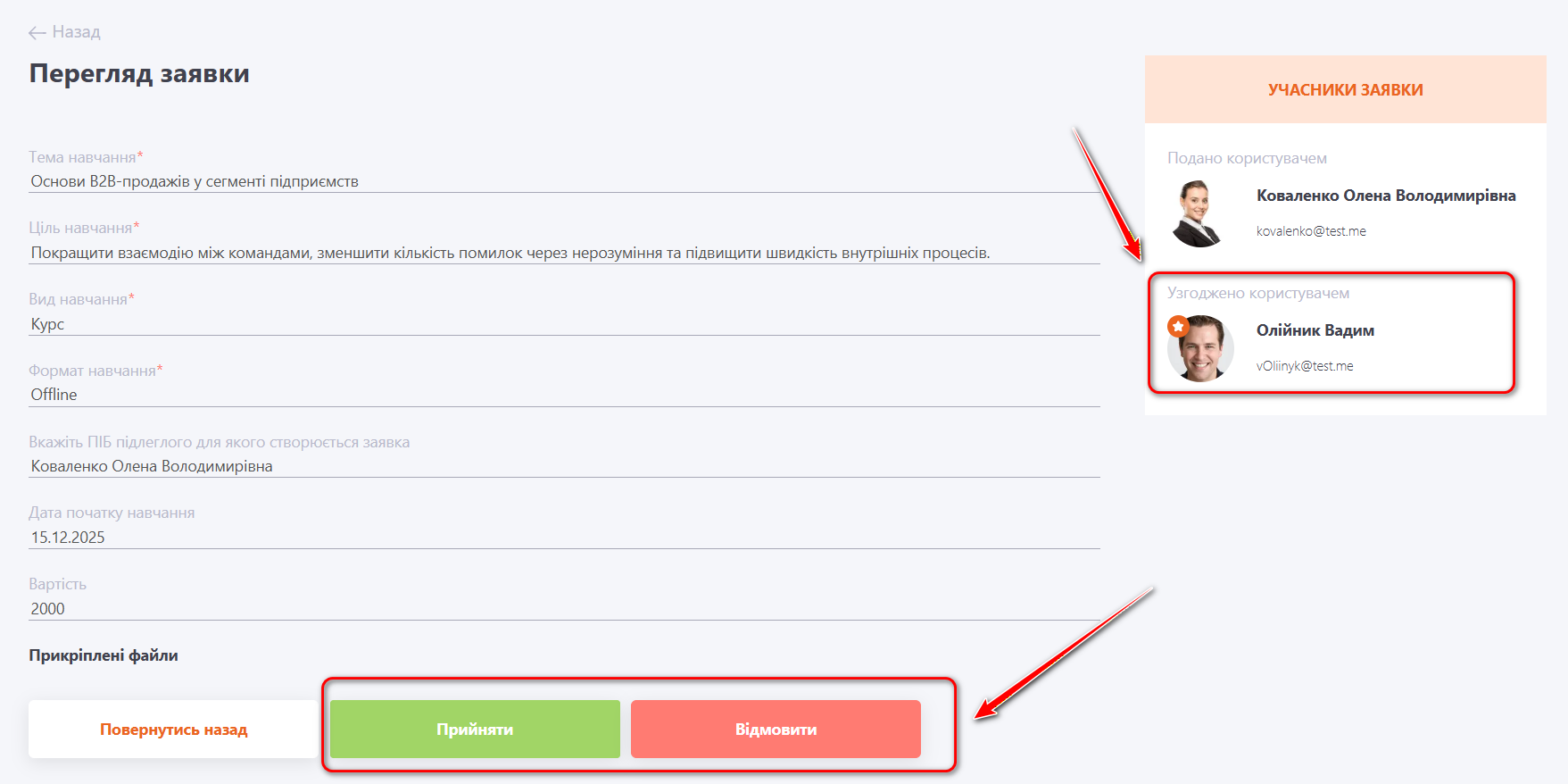 У блоці Учасники заявки зазначаються користувач, який подав заявку, та користувач, який її узгодив.