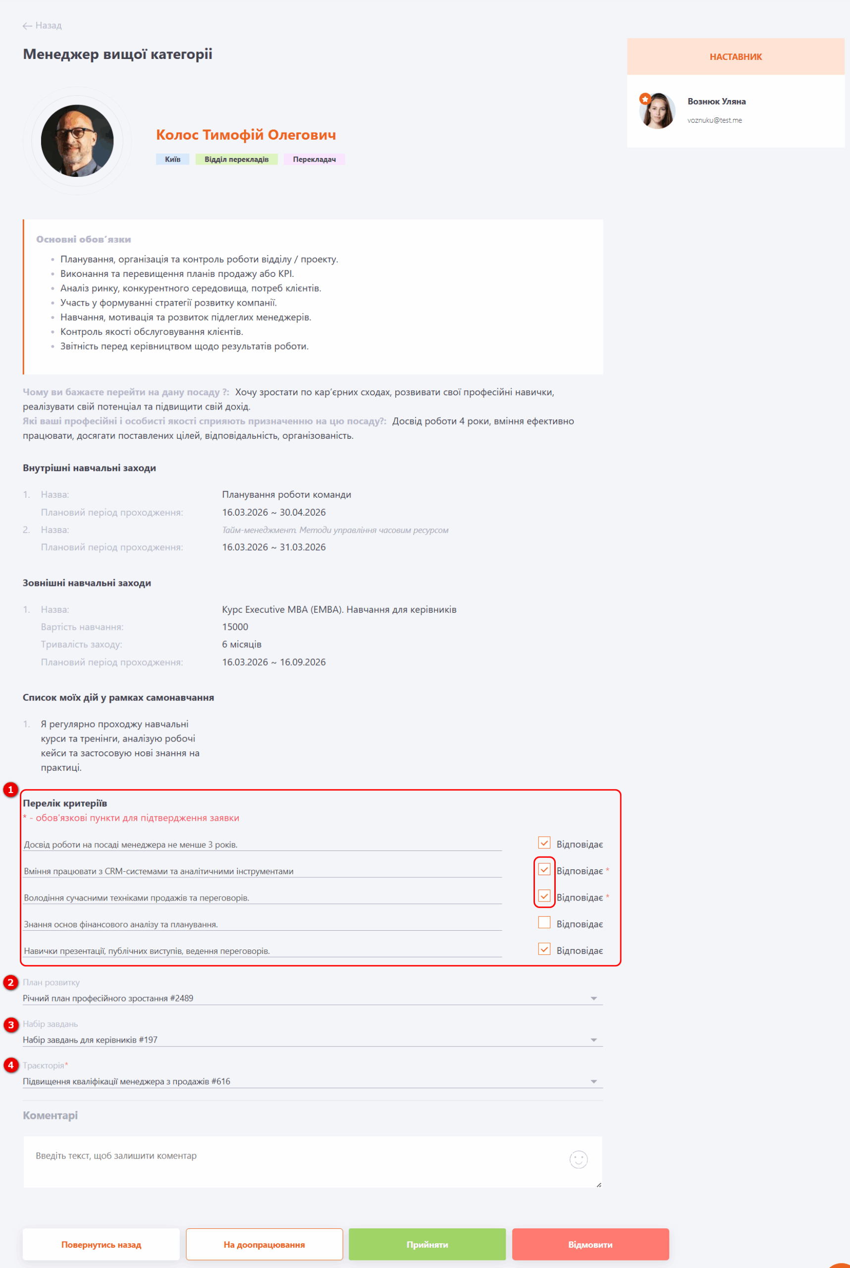 Також можна призначити Траєкторію навчання (4), яку співробітник повинен буде пройти після того, як заявка на кар'єрний розвиток буде Прийнята.