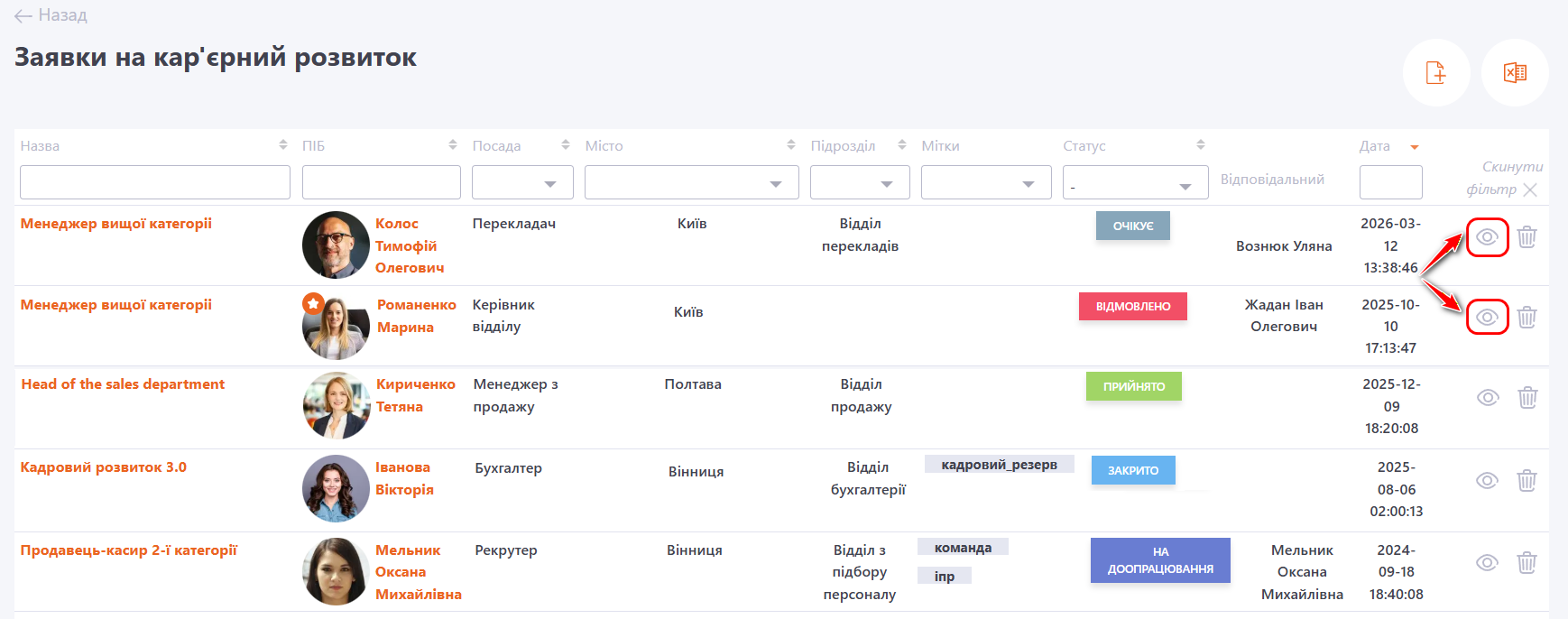 На сторінці Заявки на кар'єрний розвиток у вигляді таблиці відображається список усіх поданих заявок. За стовбцями Посада, Місто, Підрозділ, Мітки, Статус та Дата доступні фільтрація і сортування. Для перегляду певної заявки необхідно натиснути кнопку Переглянути.