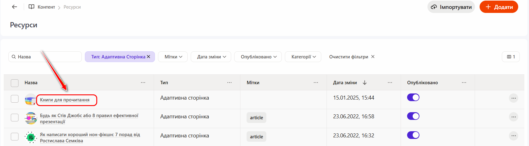 Для цього достатньо в таблиці з ресурсами (меню: Контент - Ресурси) натиснути на назву Ресурсу.