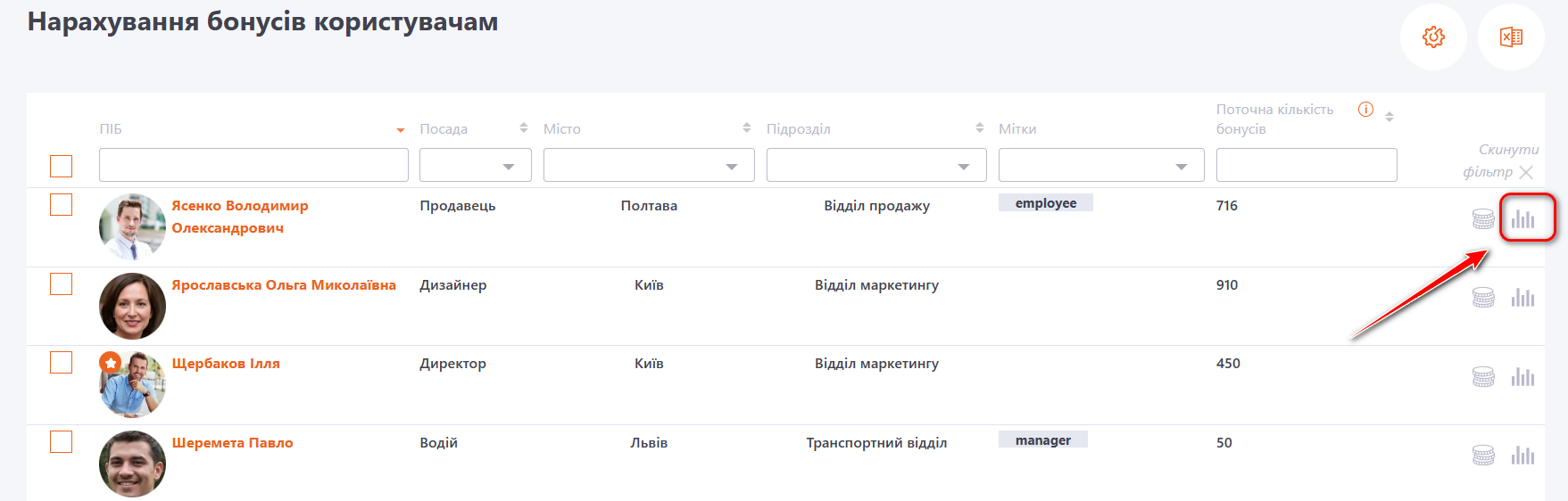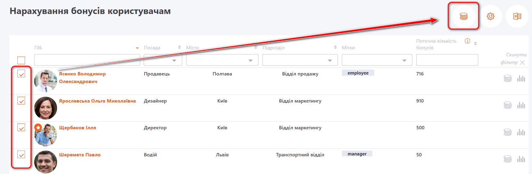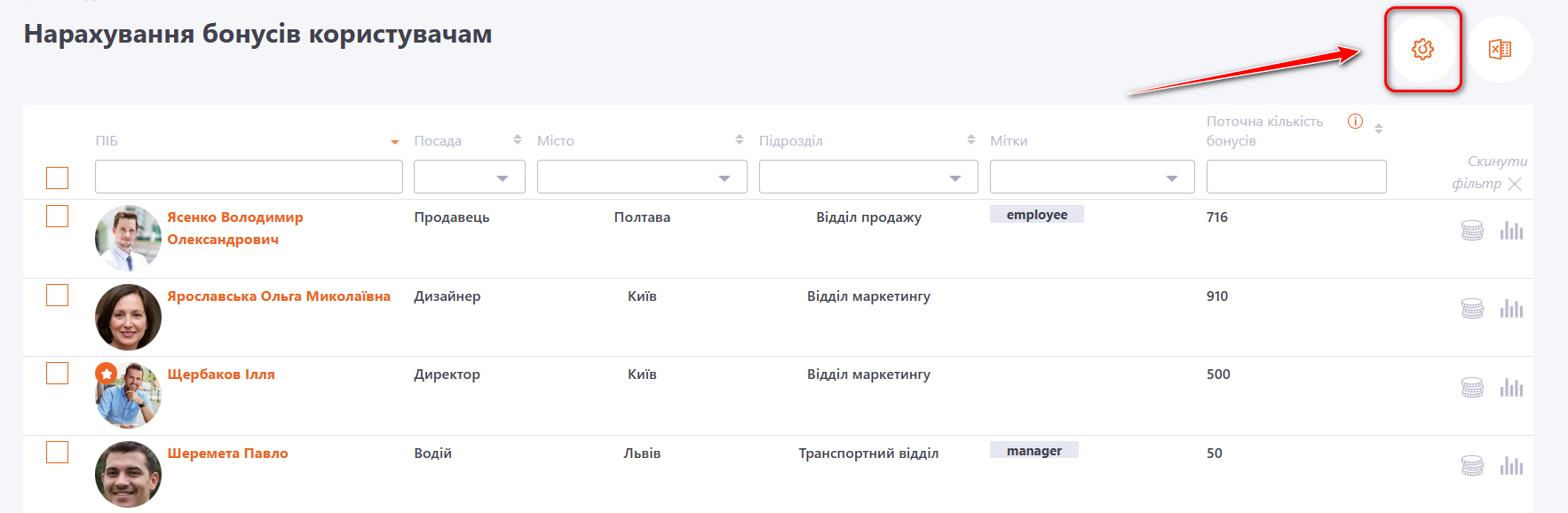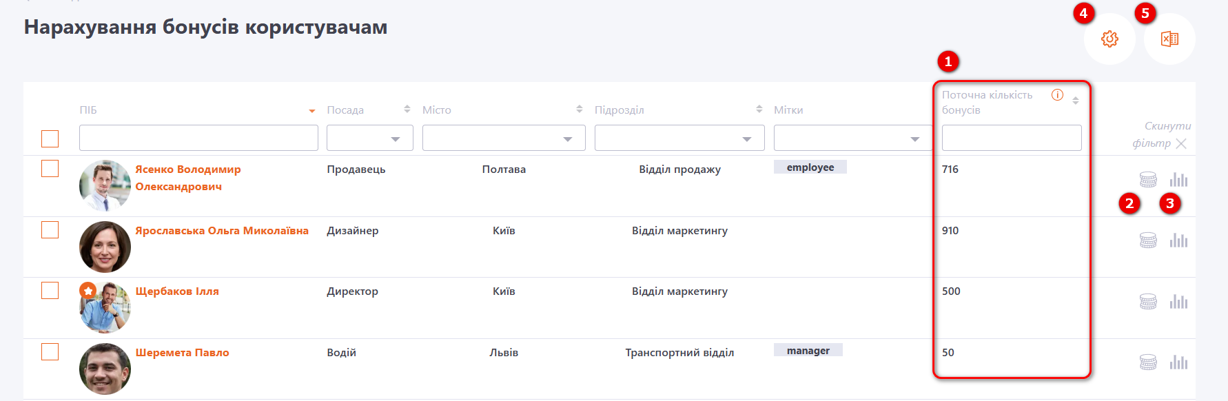 На сторінці "Нарахування бонусів користувачам" відображається таблиця з усіма активними користувачами в системі та їх атрибутами (посади, міста, підрозділи, мітки). За всіма атрибутами доступні інструменти пошуку, фільтрації та сортування.