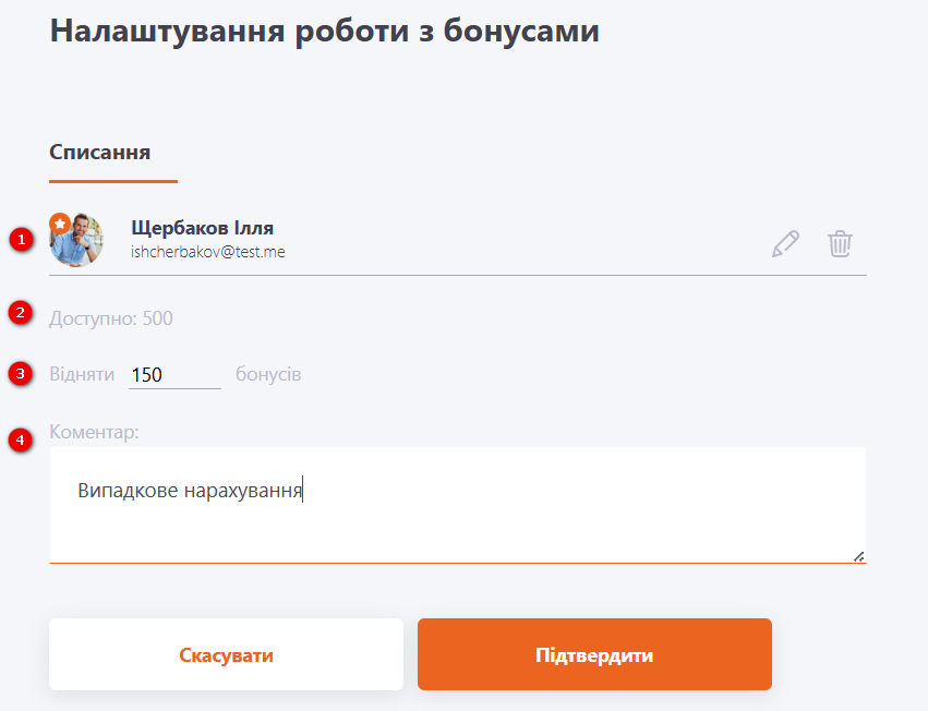 (1) - Користувач, якому потрібно списати бонуси. При натисканні на "олівець" можна ввести ПІБ для пошуку, після чого обрати зі списку потрібного користувача. При натисканні на "кошик" користувача буде знято з вибору;