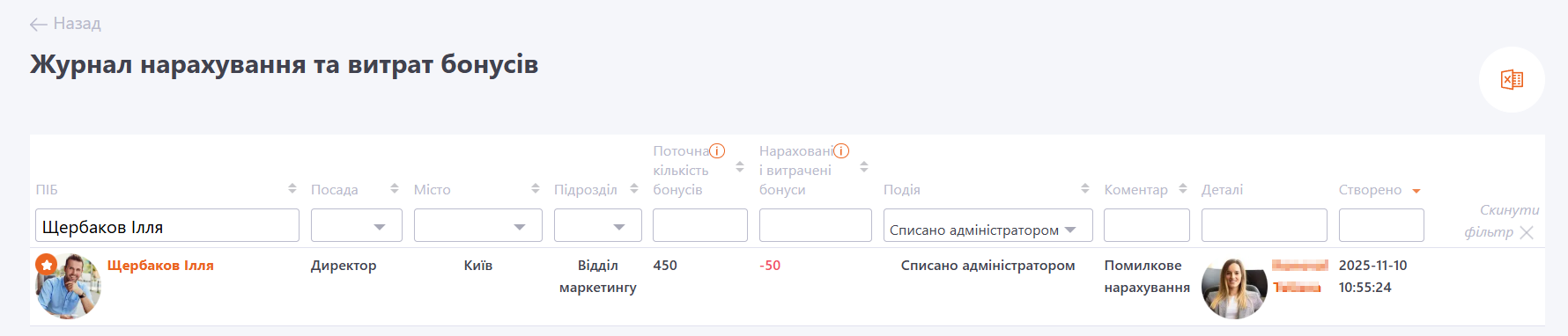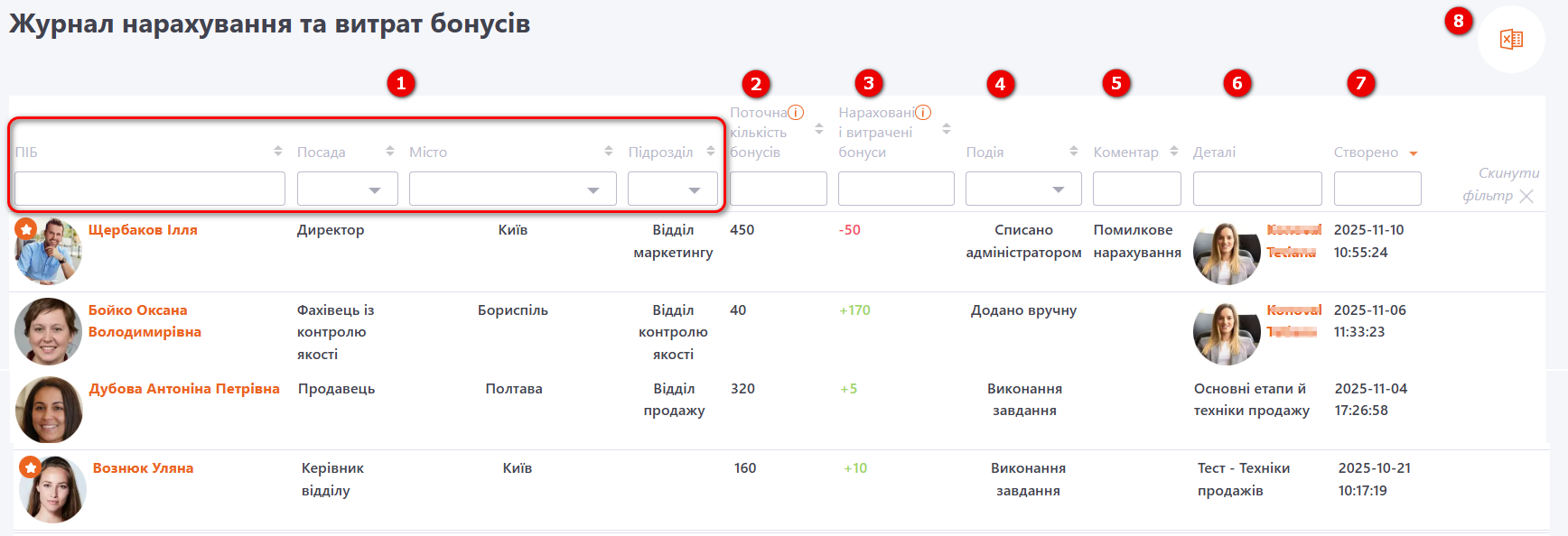 Таблицю з журналу нарахування та витрат бонусів можна вивантажити в Excel по кнопці (8).