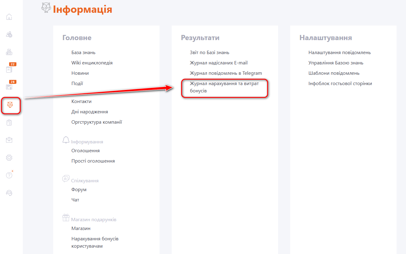 1) Перейшовши до пункту меню Інформація - Результати - Журнал нарахування та витрат бонусів: