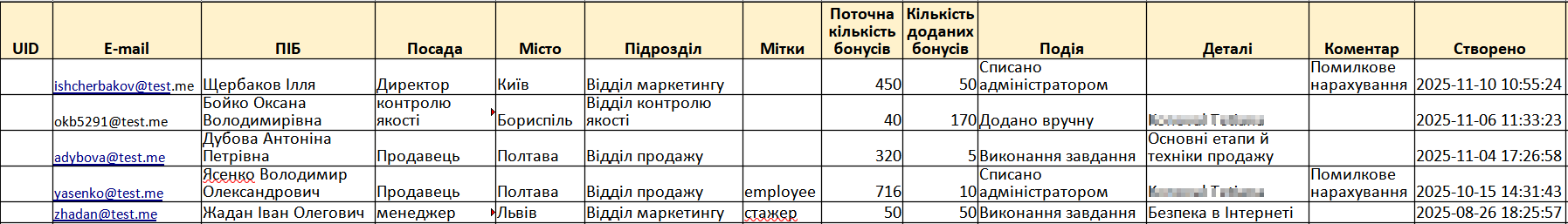 (6) - Деталі - якщо бонуси було нараховано за виконання певного завдання, тоді в деталях прописується назва завдання. Якщо ж бонуси було нараховано або списано вручну, то в деталях вказується Адміністратор, який виконав цю дію;