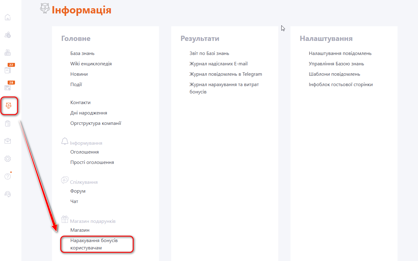 Для цього необхідно перейти з пункту меню Інформація - Магазин подарунків на сторінку Нарахування бонусів користувачам.