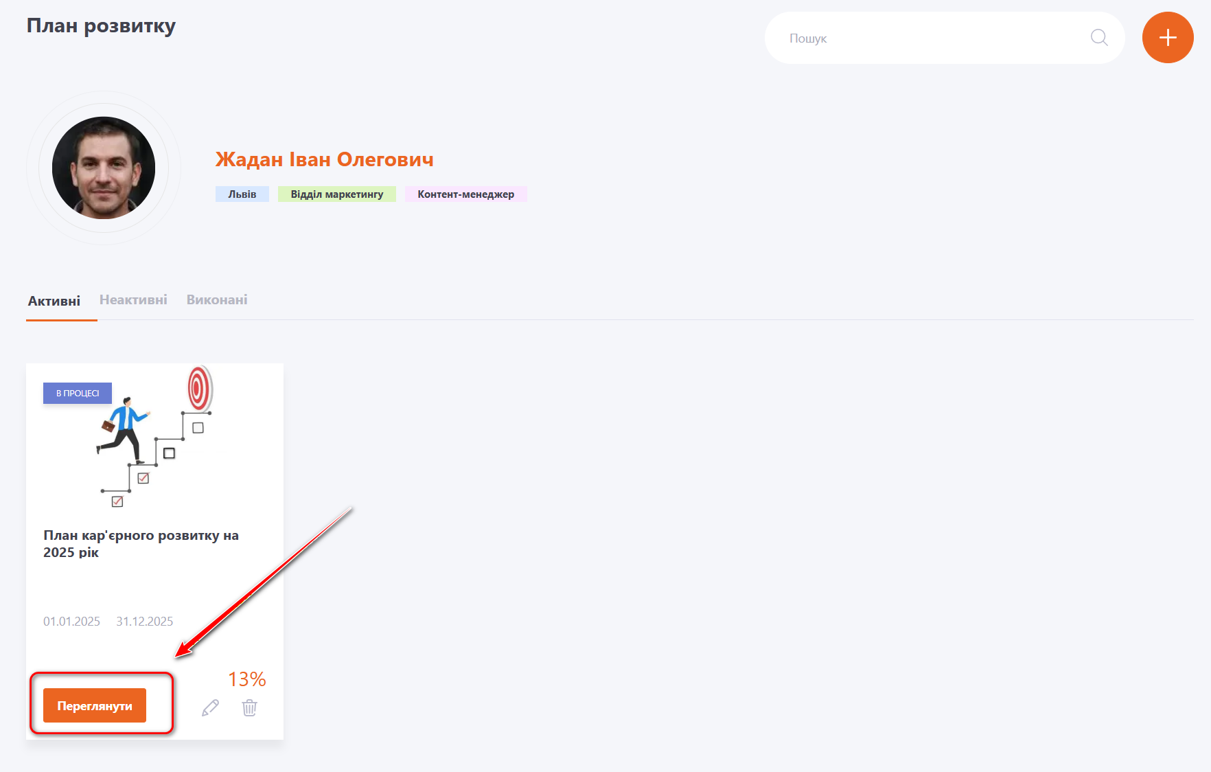 - вибрати План розвитку, до якого буде додано особисте завдання, і натиснути на кнопку "Переглянути":