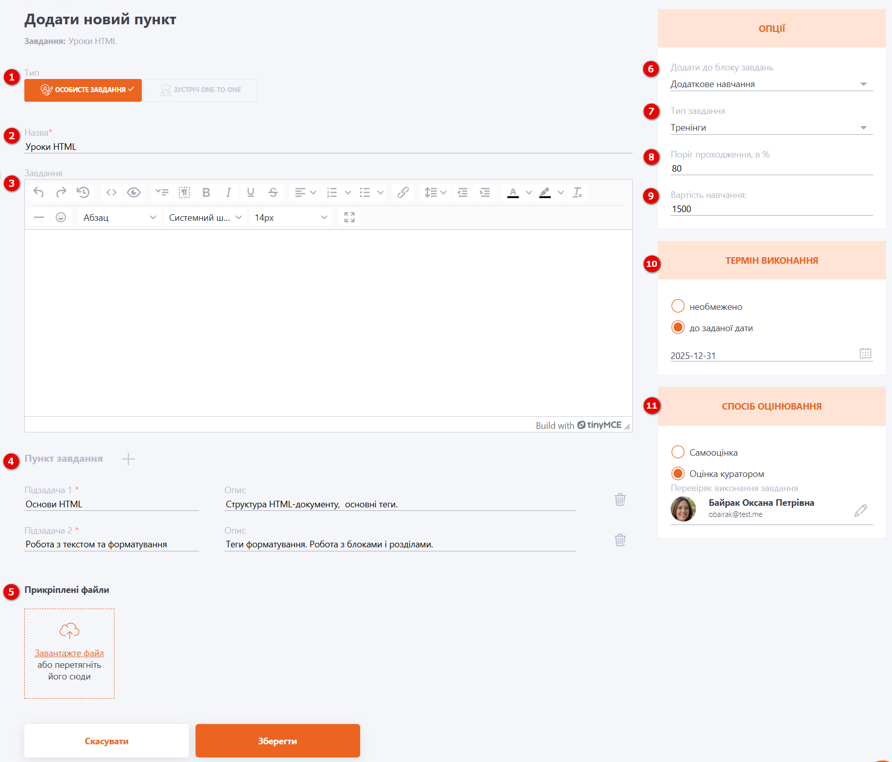 (4) - додати підпункти - завдання можна розділити на підзадачі (поля підзадач обов'язкові для заповнення, також можна заповнити їх опис). Відповідною кнопкою можна видалити пункт;