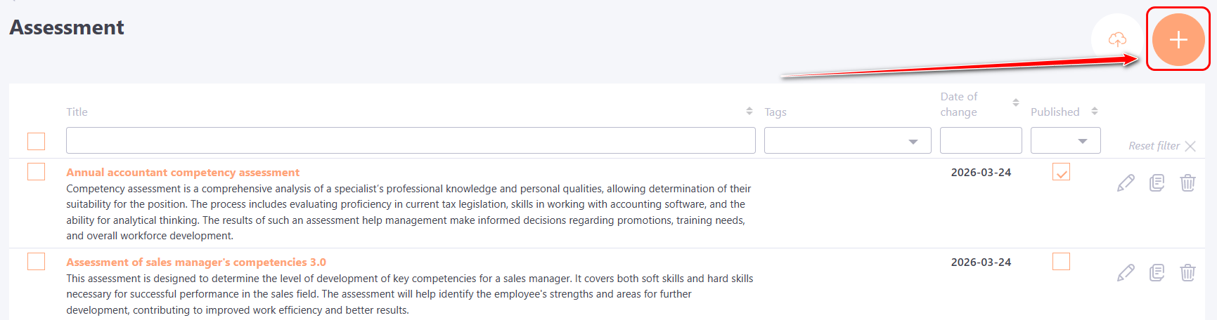(2) - Assessment description - optional field, displayed in the table with the list of created assessments along with the title.
