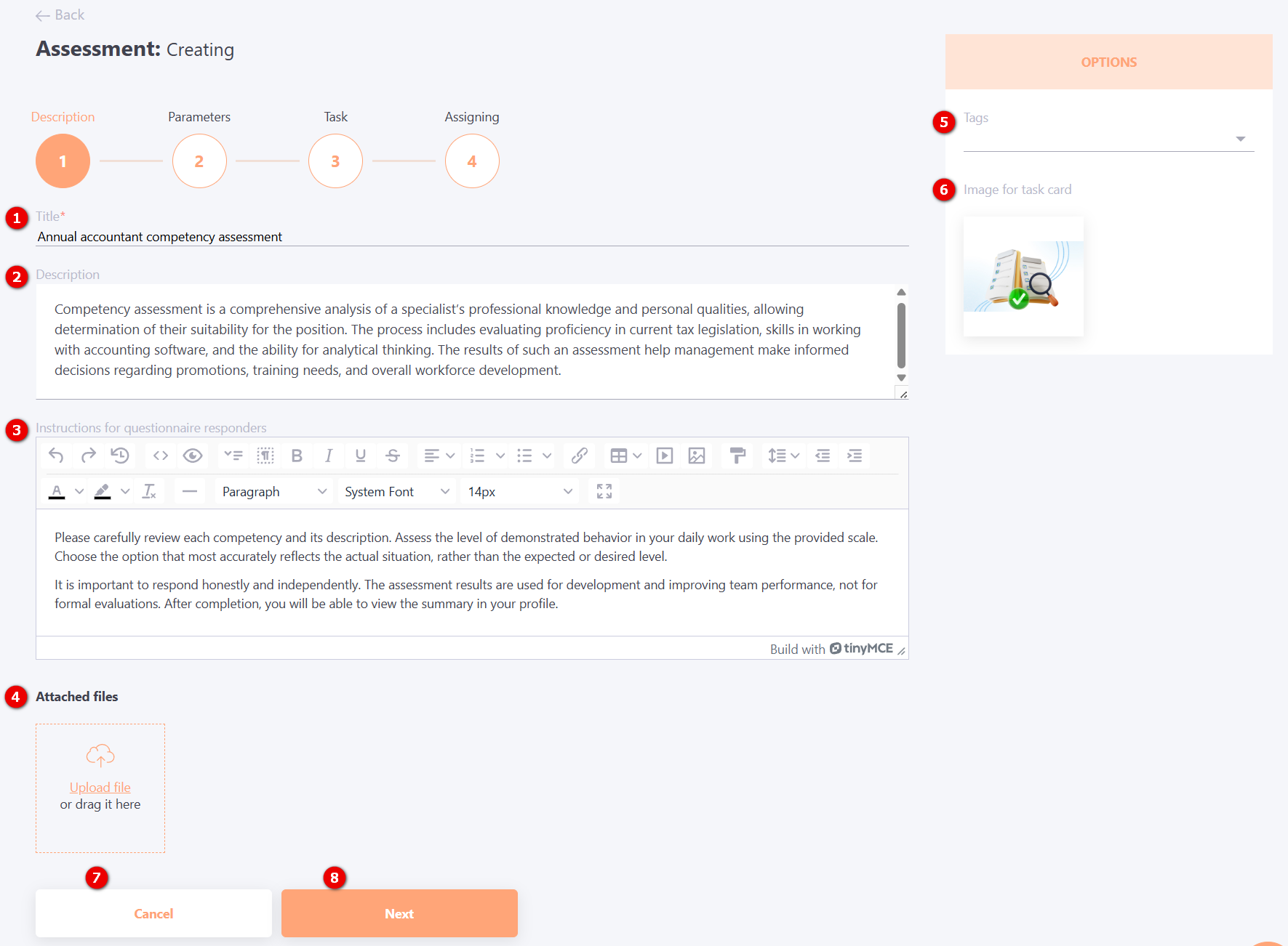 (3) - Instructions for questionnaire responders - an editor to prepare instructions for respondents who will complete the assessment questionnaire. The instructions will be displayed before the start of the questionnaire. Standard text editing and formatting tools are available, and images can also be used in the text. They can be attached using the appropriate button Upload file (4), allowed formats: jpg, png, jpeg, gif, svg.