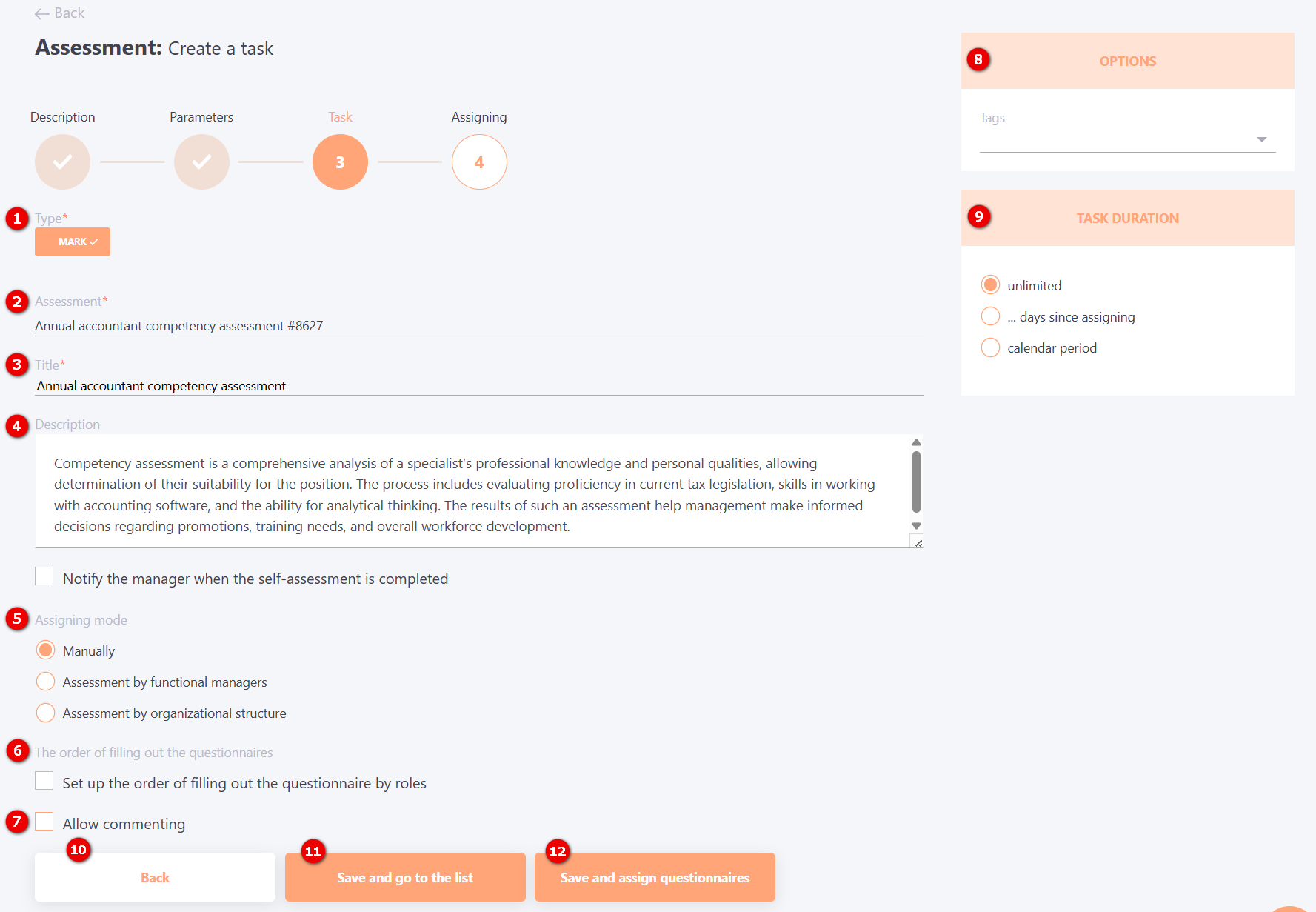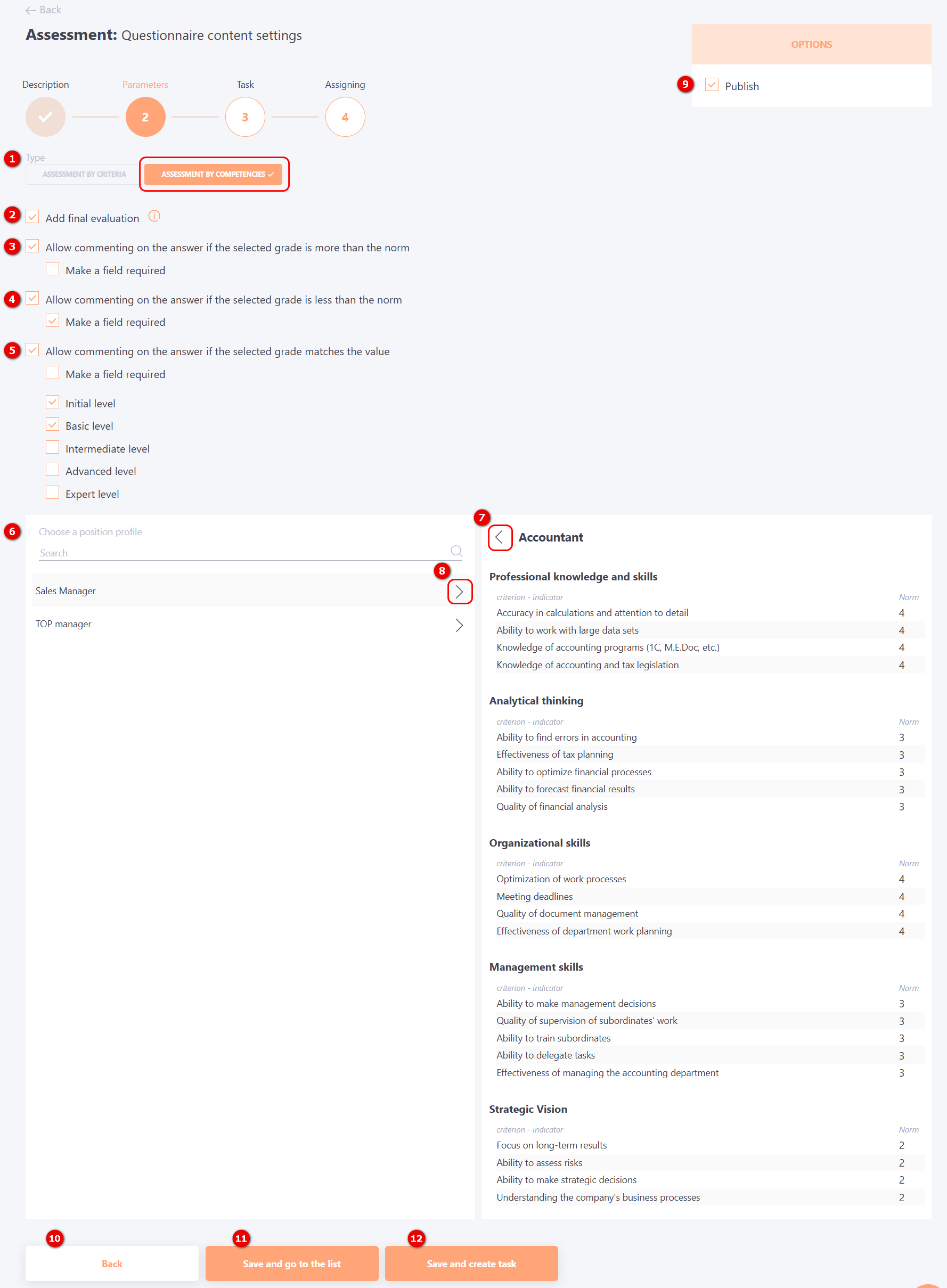 Button (9) allows you to publish the assessment. This action also activates the "Save and create task" (12) button (tasks can only be created from a published assessment). Alternatively, you can "Save and go to the list" (11) – this allows you to prepare the assessment in advance and create the task later.