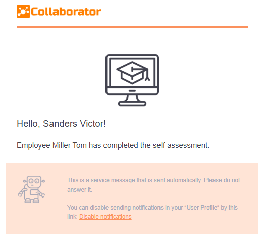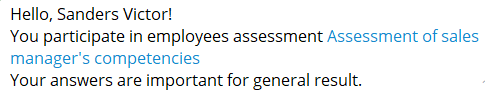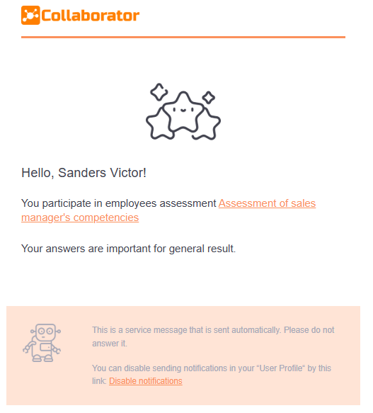 Notification to the user about participation in the assessment. The notification is sent when the user is assigned a questionnaire for assessment.