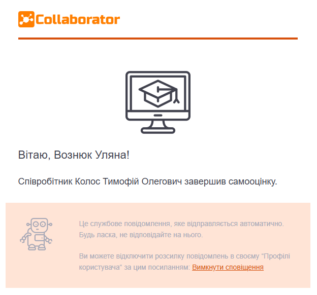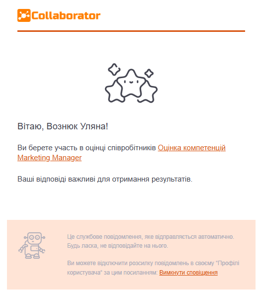Зверніть увагу! В межах одного завдання користувачу може бути призначено одразу кілька анкет для оцінювання. В такому випадку відправляється лише один лист про призначення. Якщо після заповнення всіх анкет буде призначена ще одна анкета - буде відправлено нове повідомлення.