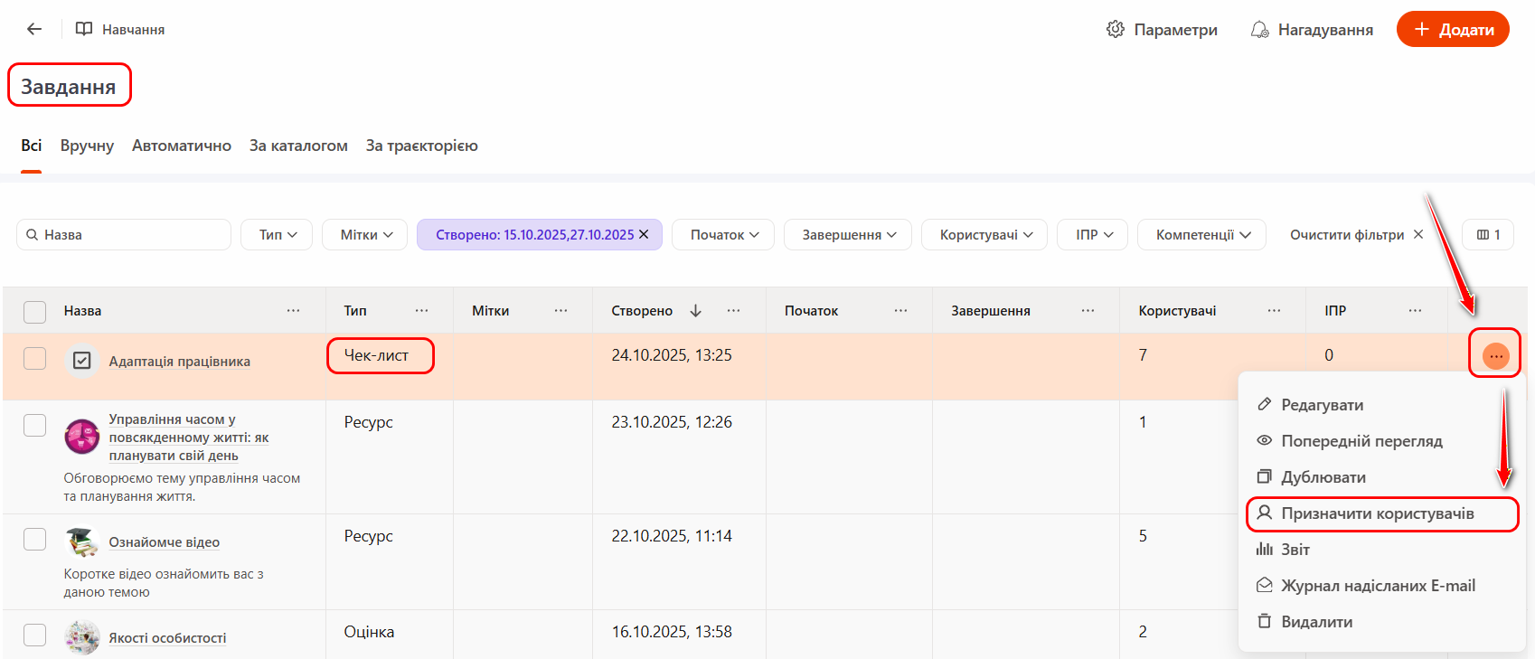 Вручну - за допомогою кнопки Призначити (1) можна додати завдання користувачам по одному. Натиснувши кнопку «Дії (2)», можна Прибрати користувача з призначення на завдання або Повідомити його про оновлення завдання.