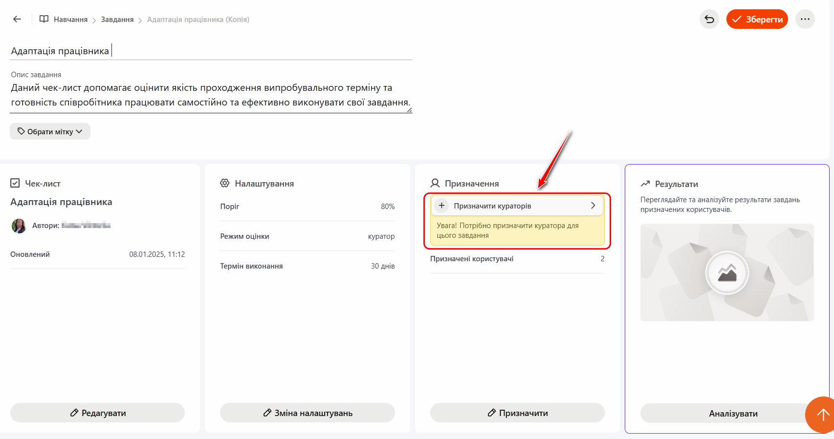 На сторінці Призначення користувачів відображаються обрані налаштування: Режим оцінки: куратор (функціональний керівник).