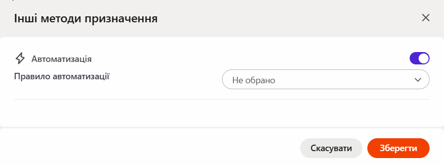 Автоматизація - користувачі призначаються на завдання автоматично за заздалегіть створеному правилу автоматизаціі. Детальніше: Правила автоматизації.