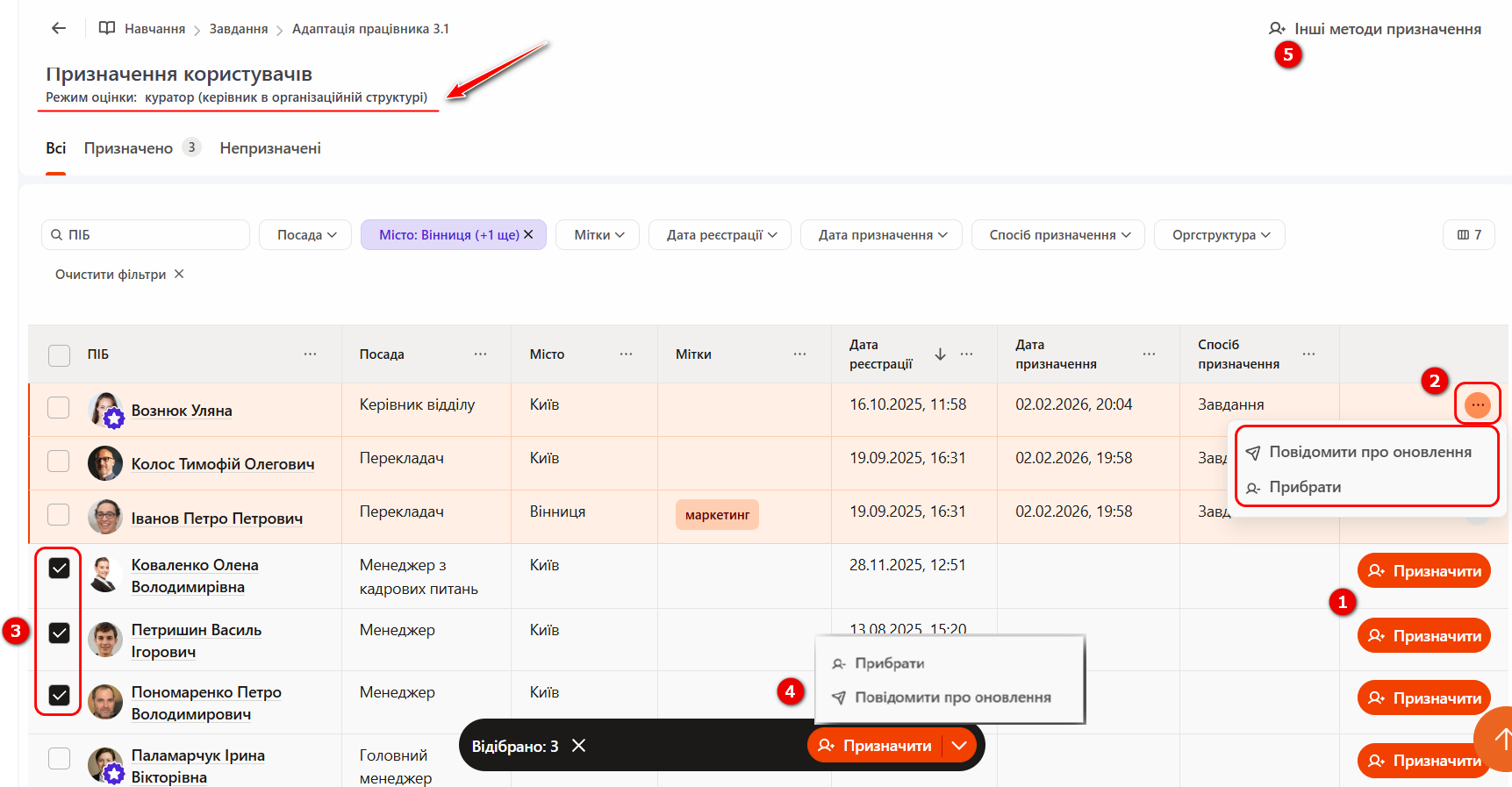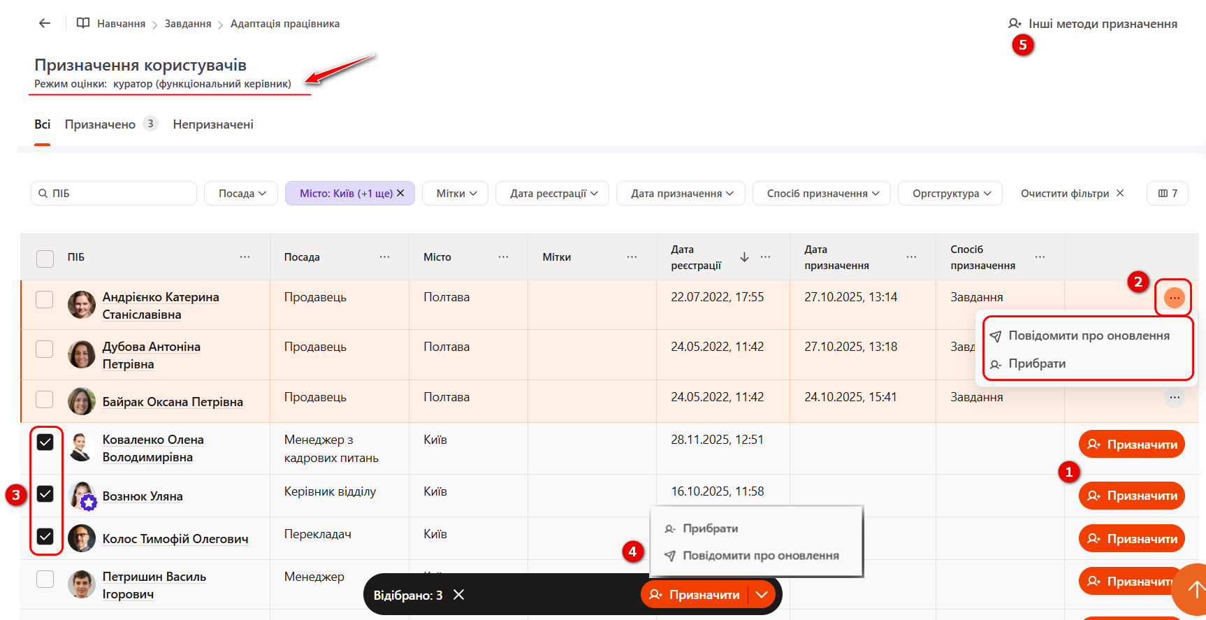 Груповим призначенням - для одночасного призначення кількох користувачів необхідно відмітити іх чекбоксами (3) ліворуч. Після цього внизу сторінки відобразиться модальне вікно (4) з доступними груповими діями. За замовчуванням відображається кнопка «Призначити», натиснувши на стрілку, доступні також дії: «Прибрати з завдання» та «Повідомити про оновлення». Якщо зняти чекбокси, модальне вікно з груповими діями автоматично приховується.