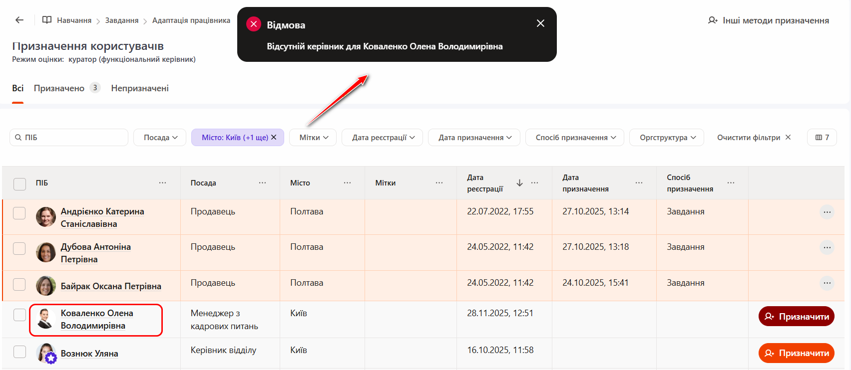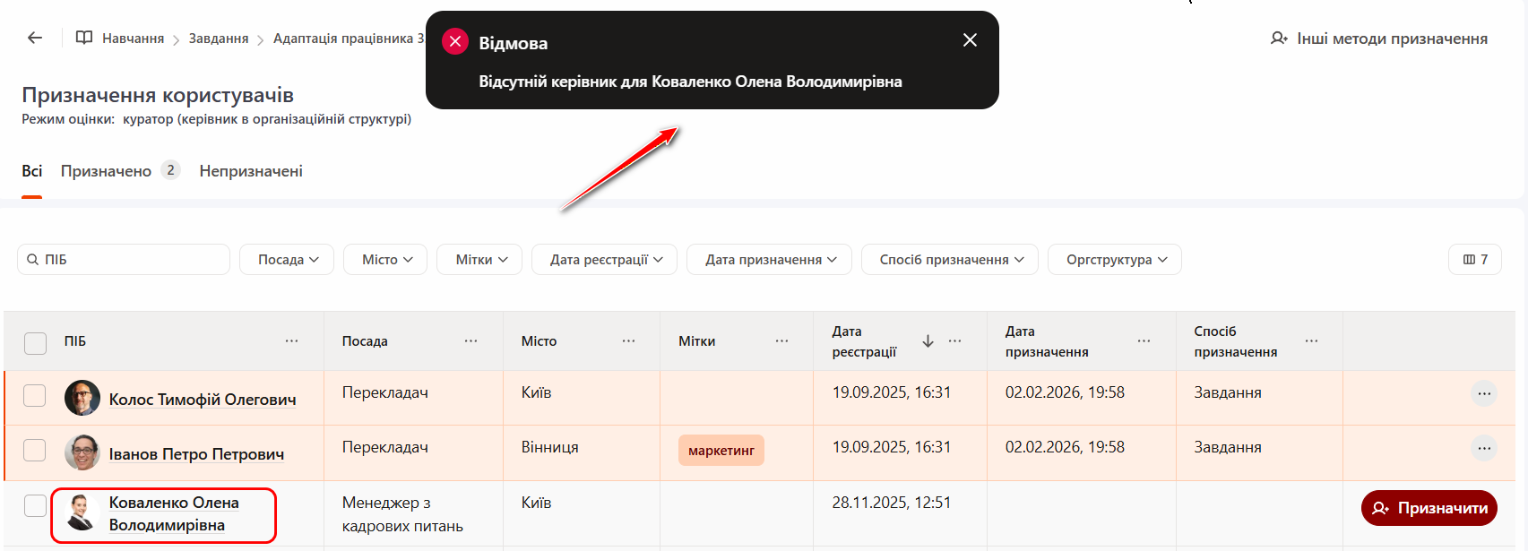 Якщо у співробітника не вказано керівника в оргструктурі, система не зможе призначити його на завдання. У такому разі після спроби призначення з’явиться повідомлення про відмову: