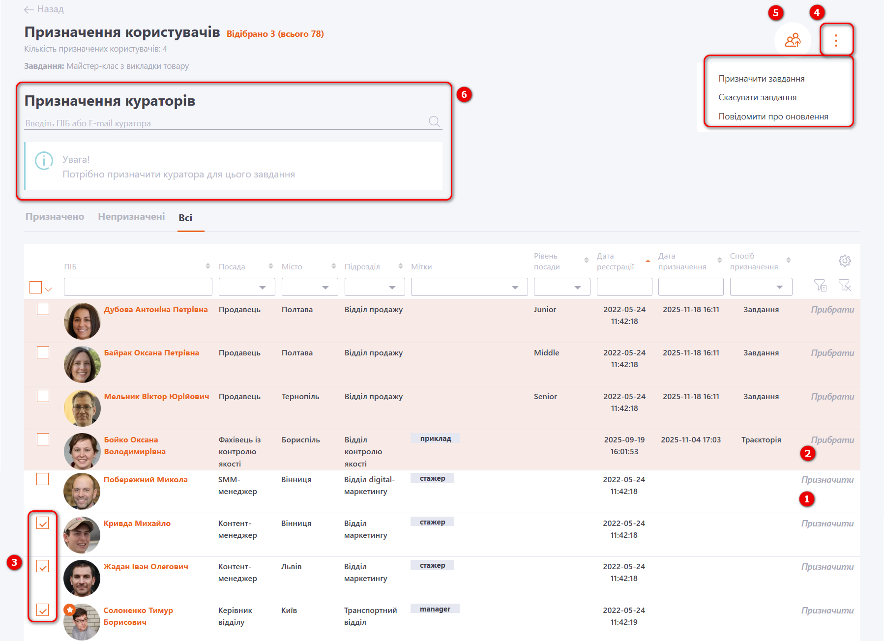 (2) Прибрати - кнопка для зняття користувача з завдання. - груповим призначенням за допомогою кнопки Дія (4). Для цього необхідно виділити потрібних Користувачів чек-боксами зліва (3) та натиснути кнопку Дії (4) - Призначити завдання.