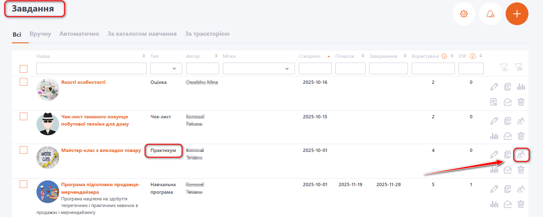 Для призначення користувачів на Практикум необхідно відкрити в меню Навчання - Завдання сторінку Завдання, в таблиці обрати потрібний Практикум і натиснути кнопку Призначити .