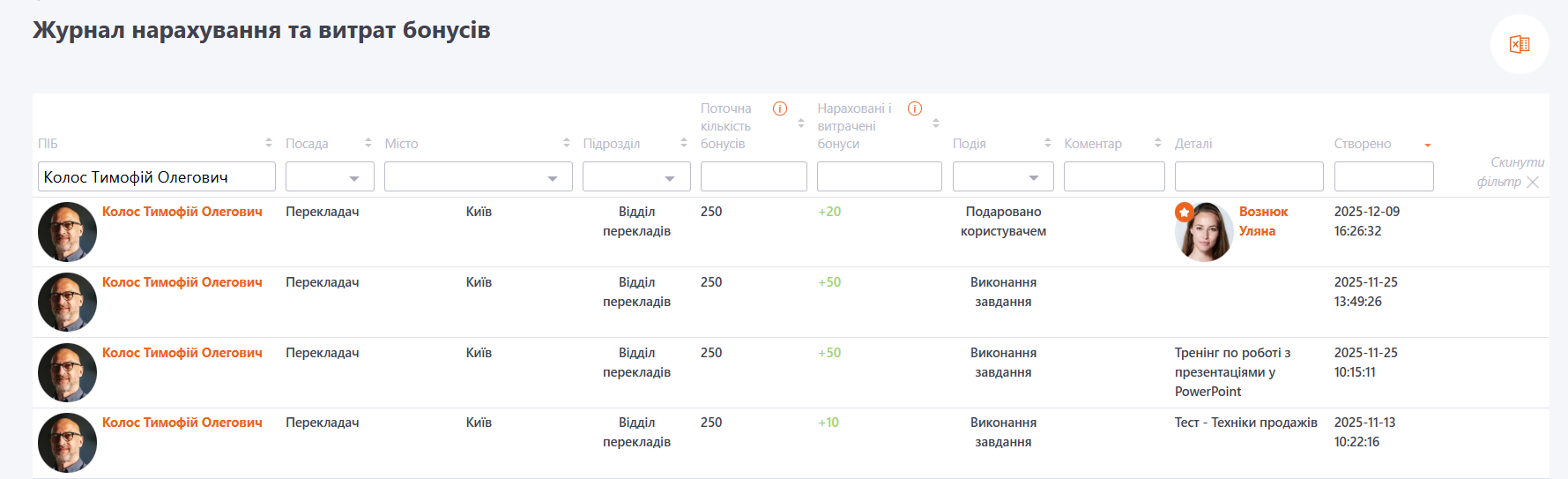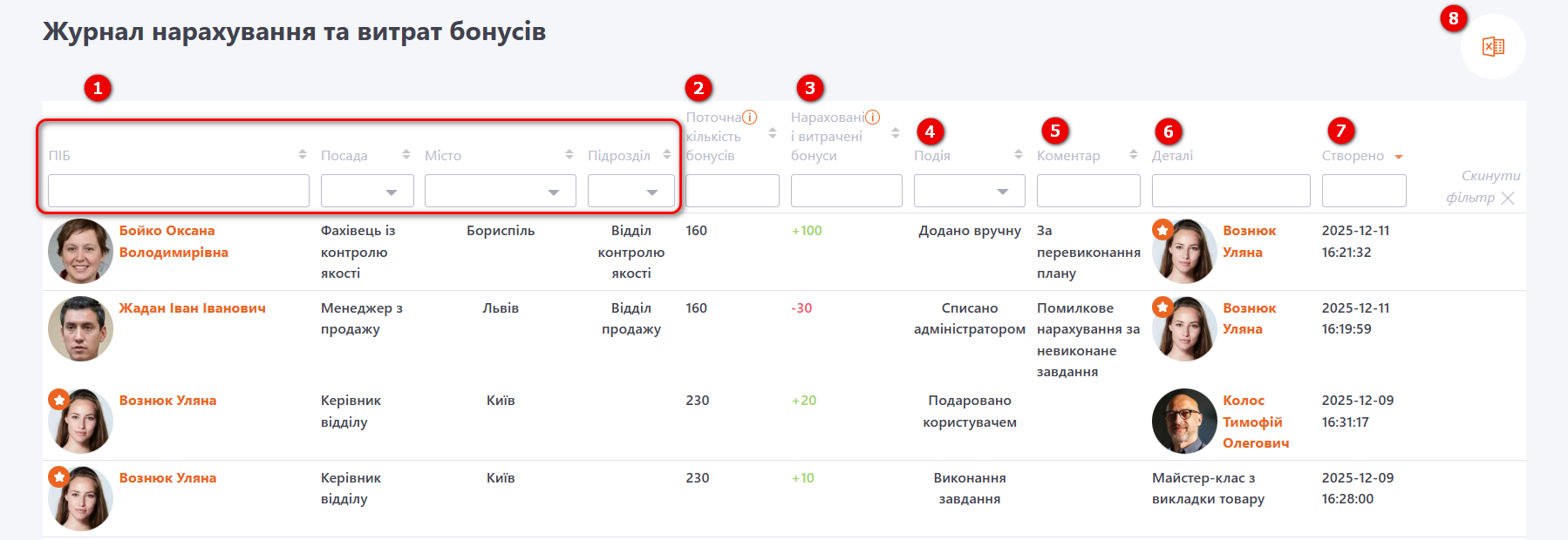Таблицю з журналу нарахування та витрат бонусів можна вивантажити в Excel по кнопці (8).