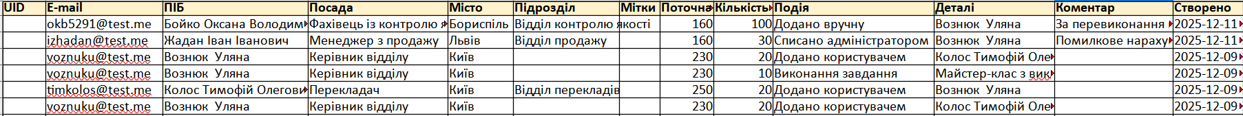 Після цього відкриється сторінка Журнал нарахування та витрат бонусів, де відображаються всі події, пов’язані з бонусами (нарахування та списання), для вибраного користувача.