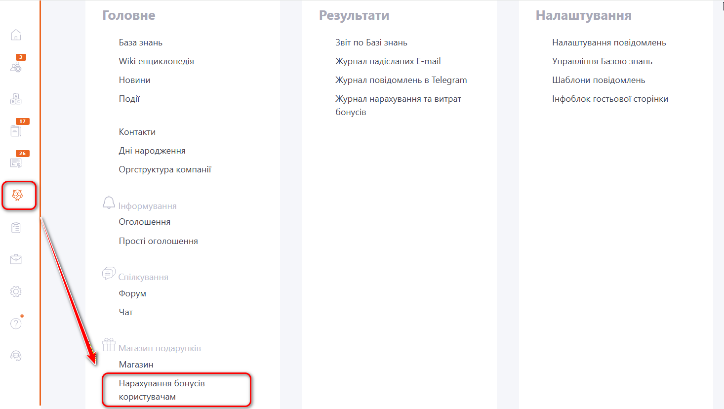 - Через меню Інформація - Магазин подарунків - Нарахування бонусів користувачам: