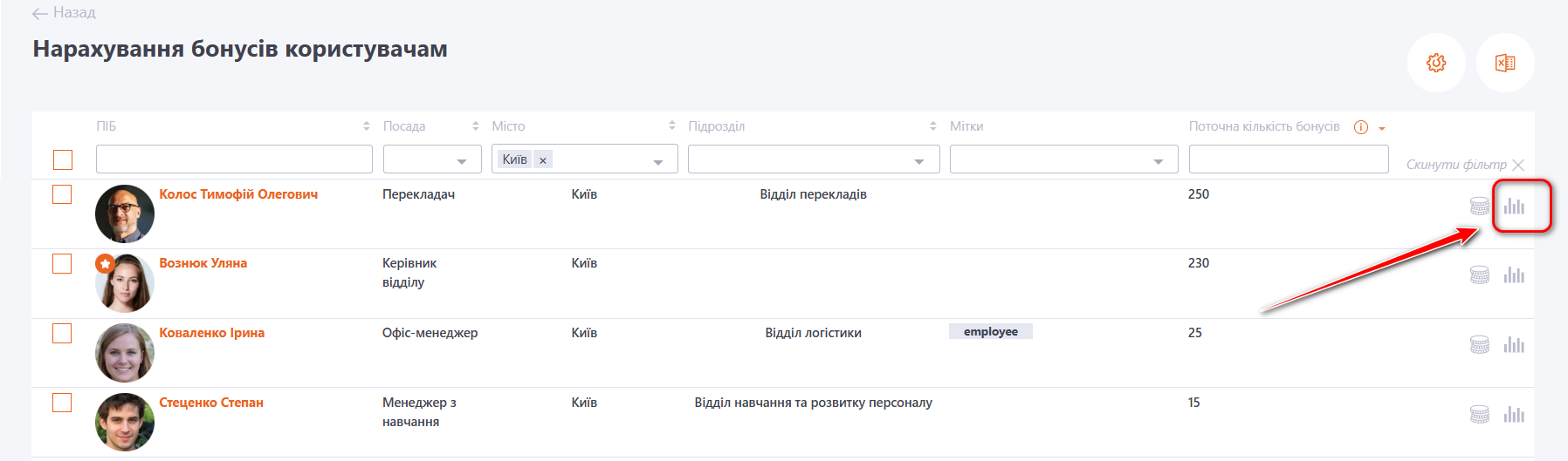 На сторінці Нарахування бонусів користувачам необхідно натиснути кнопку Журнал нарахування та витрат бонусів