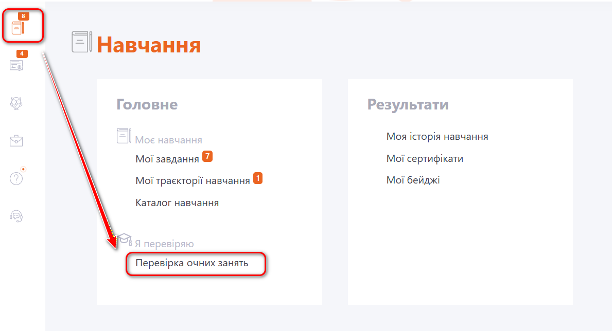 Для оцінки Очного заняття користувачу, призначеному як куратор, потрібно перейти в меню Навчання - Я перевіряю - Перевірка очних занять