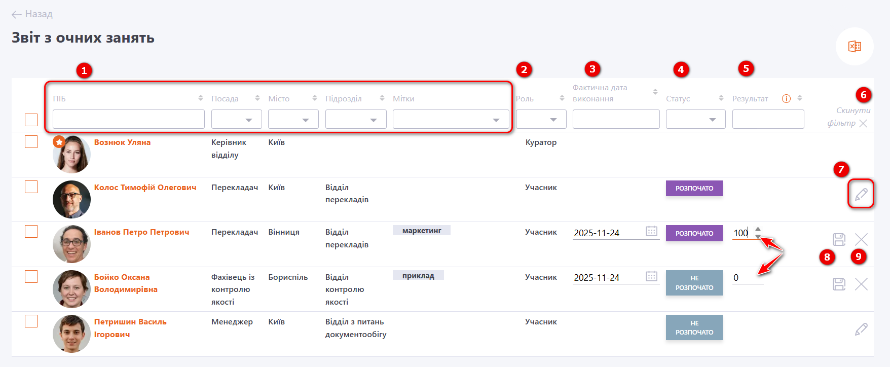 Для оцінювання конкретного користувача необхідно у відповідному рядку натиснути кнопку Змінити (7). Поля Фактична дата виконання та Результат стануть доступними для редагування. Куратору потрібно проставити у відсотках результат виконання завданння та за необхідності відкорегувати фактичну дату виконання завдання. Система автоматично визначить статус — «Виконано» або «Провалено» — відповідно до встановленого порогу проходження завдання, детальніше Статуси для очних занять.