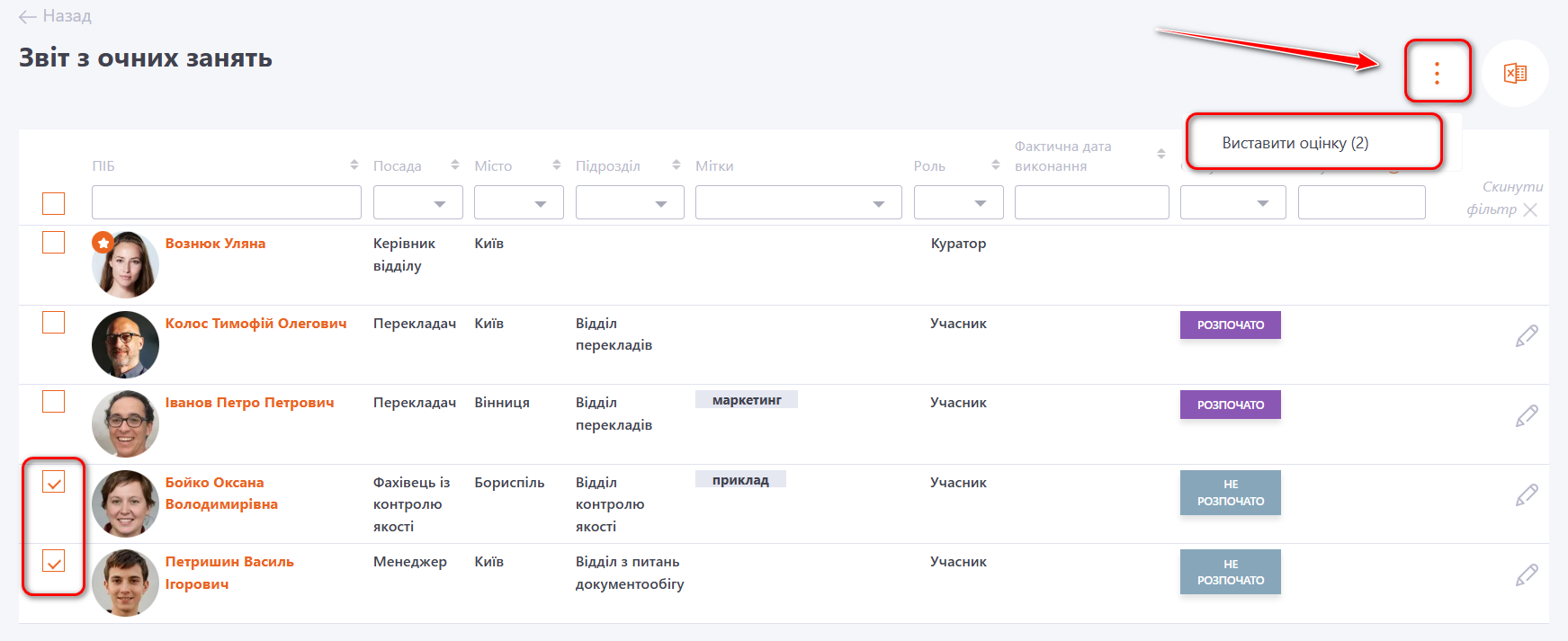 Для цього потрібно видмітити чекбоксами користувачів, натиснути кнопку Дія - Виставити оцінку.