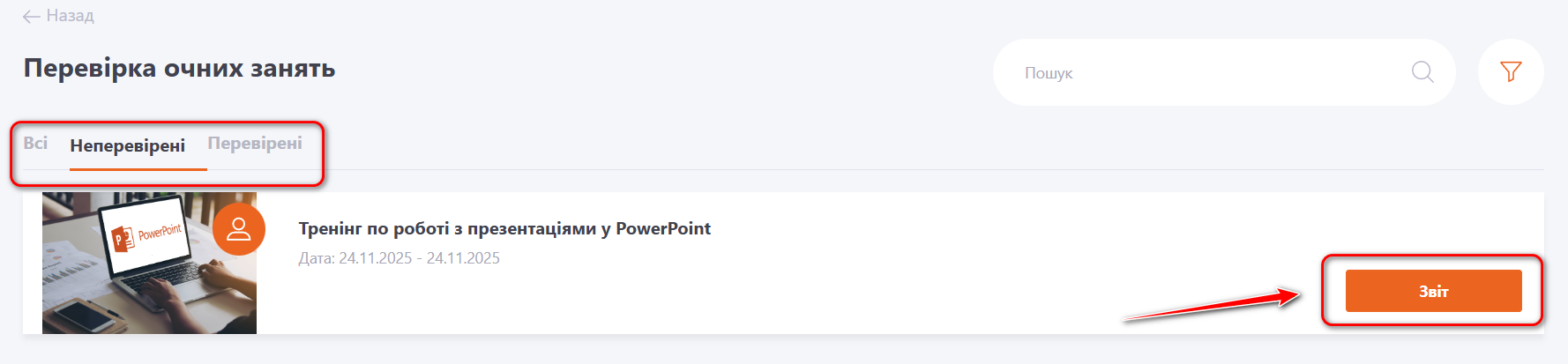 Сторінка Перевірка очних занять автоматично відкриється на вкладці Неперевірені завдання. На вкладках Всі і Перевірені можна переглянути відповідно всі завдання або лише ті, що вже пройшли перевірку.