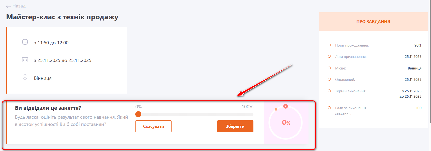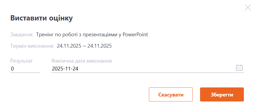 Користувач має виставити оцінку від 0 до 100% і натиснути кнопку Зберегти. Після цього система автоматично порівнює зазначений результат із порогом проходження, встановленим для завдання, і визначає відповідний статус — «Виконано» або «Провалено».