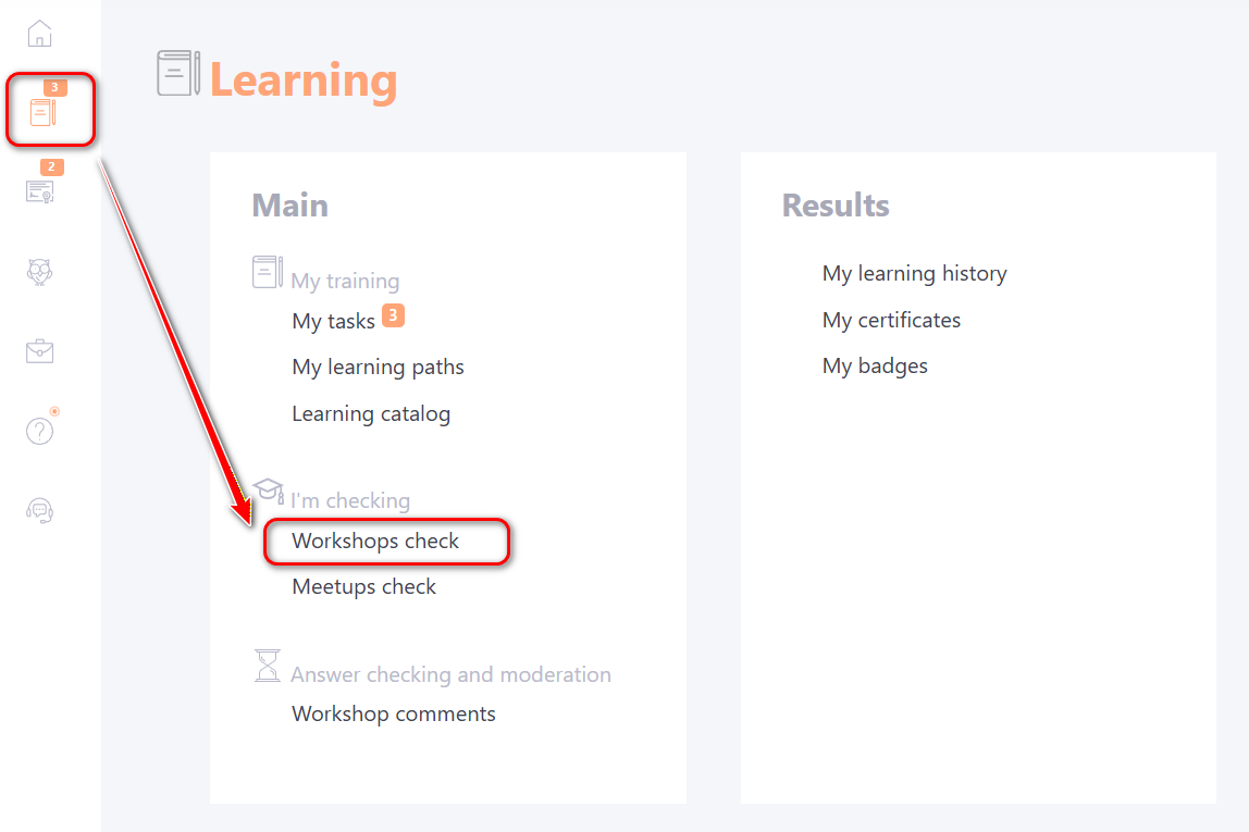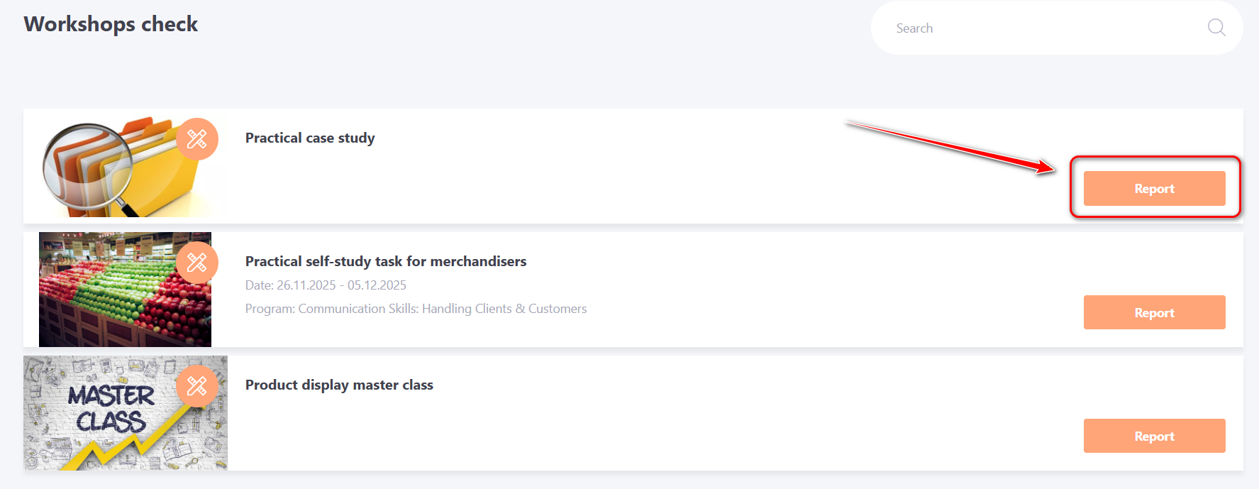 To check a workshop from the report, go to Learning - I'm checking - Workshops check.