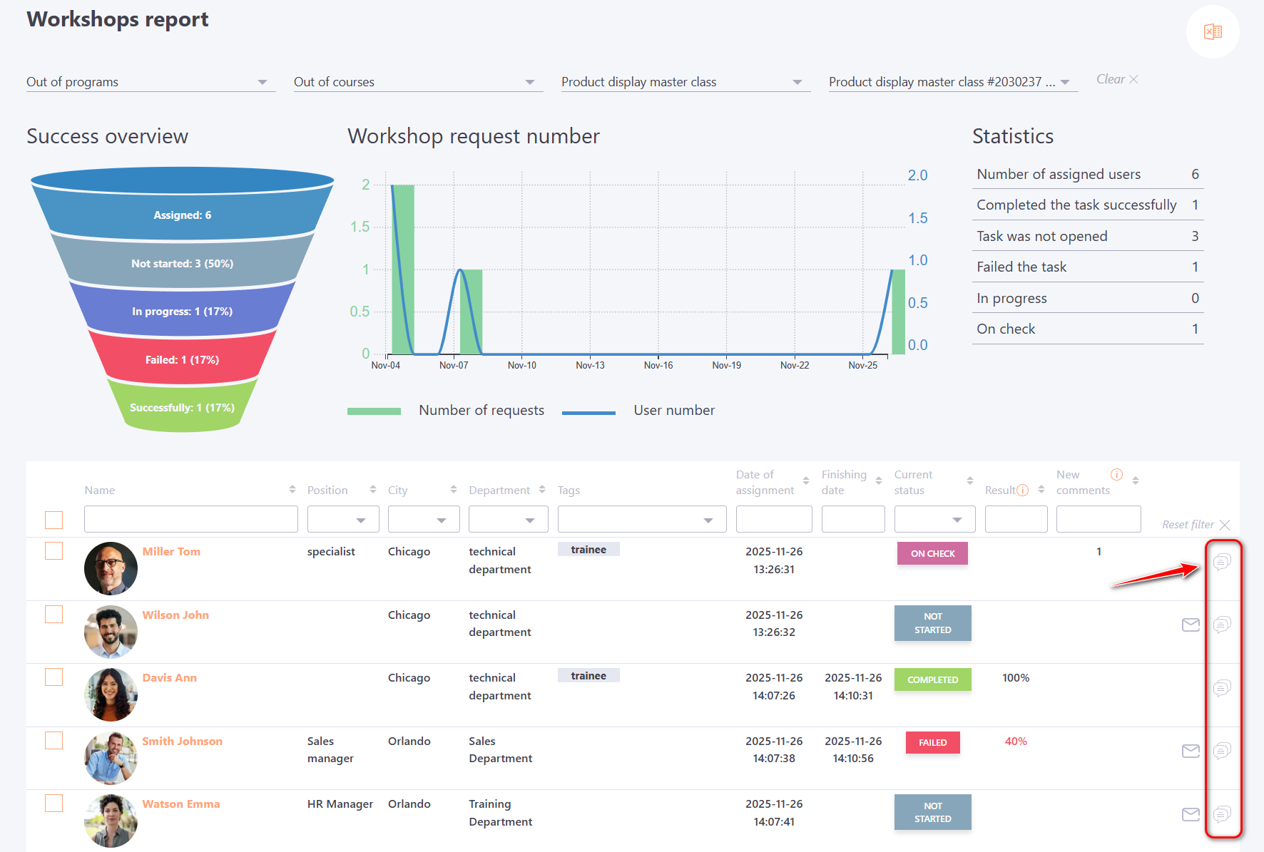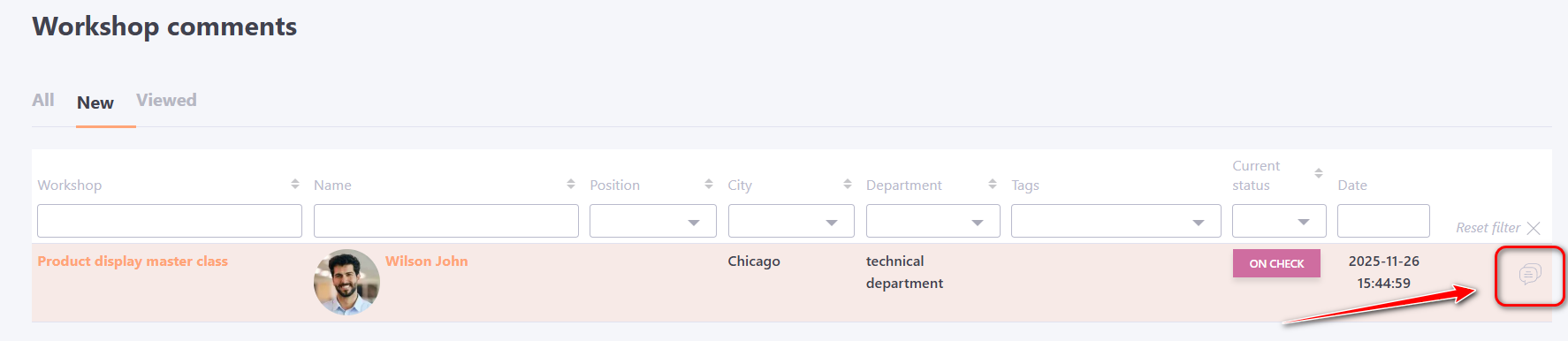 When selecting this section, you are redirected to the “Workshop Comments” page, where users who have left new comments for checking are displayed. Viewing previous comments is available in the “All” tab.