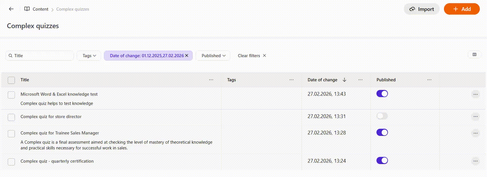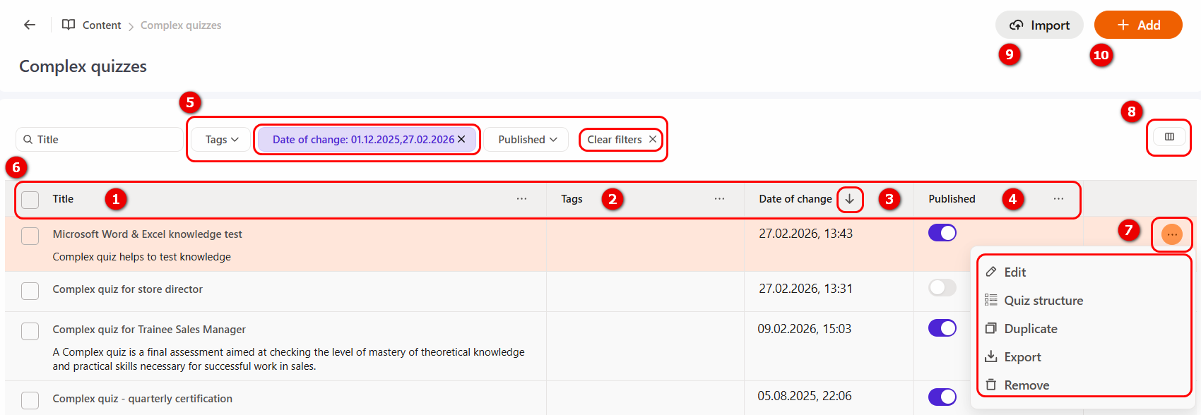 (10) - Add - clicking the button will open the complex quiz creation page. For more information: Сreating Complex quizzes