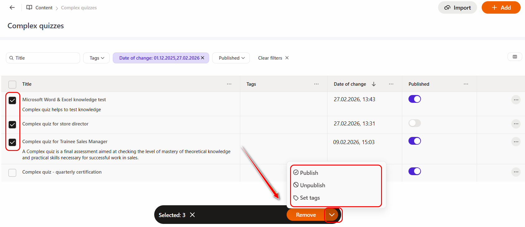 By default, the "Remove" button is available, and by clicking on the arrow next to it, you can additional options: Publish, Unpublish, or Set tags.