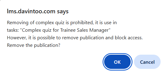 - Remove — clicking the Remove button opens a confirmation window. If the complex quiz is used in courses, programs or tasks, it cannot be deleted; instead, the system suggests unpublishing it.