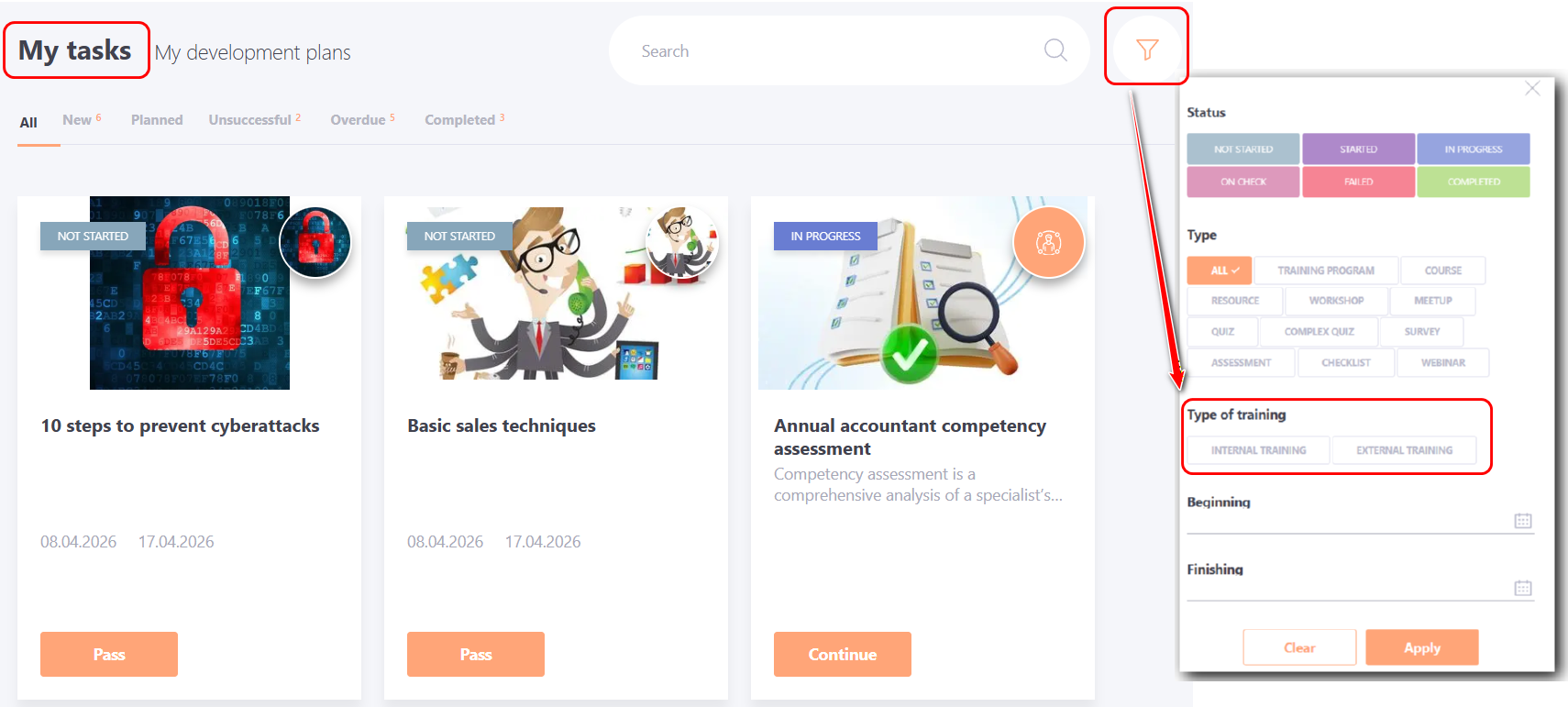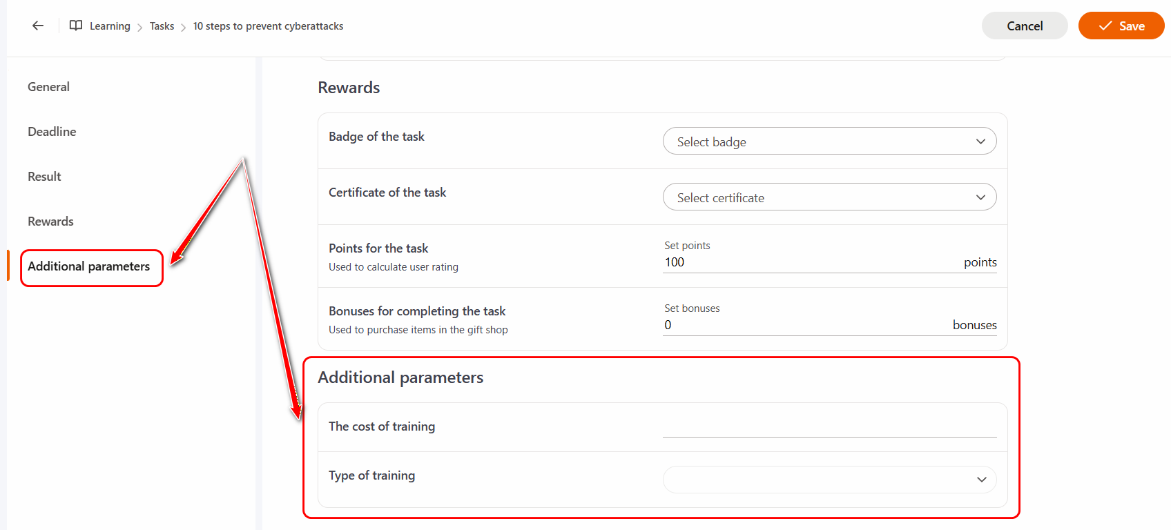 On the task table page, you can configure Additional parameters for tasks. These are used when the standard fields are not sufficient and you need to specify specific information (for example, training type, cost, etc.).
