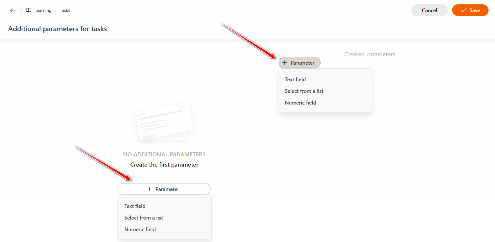 On the "Additional parameters for tasks" page click the Parameter button and select the required type from the dropdown list: