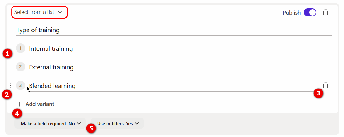 (4) - Publish – enables or disables the parameter. When switched on, the parameter appears in the task settings. Additionally, corresponding columns for active parameters are displayed in the Learning History report. See more: Learning history.