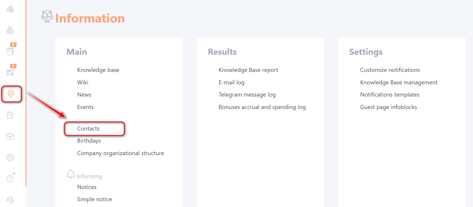 Access to the Contacts menu is regulated by the corresponding Contacts module, which is connected by Technical Support.