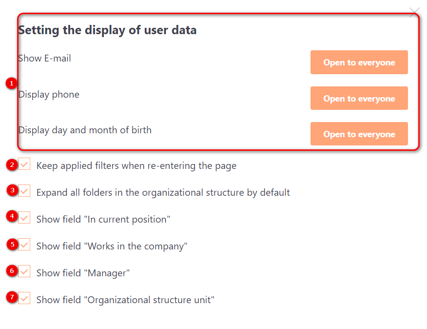 (7) Show field "Organizational structure unit" - if the setting is enabled, then the current user's department within the organizational structure is displayed. Clicking on the department name in the sidebar automatically displays this department and searches for users within this department. In the screenshot above, the 'Department in the Organizational Structure' field is activated, marked as 2.