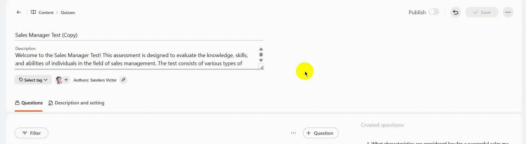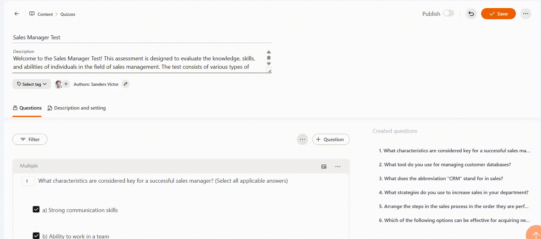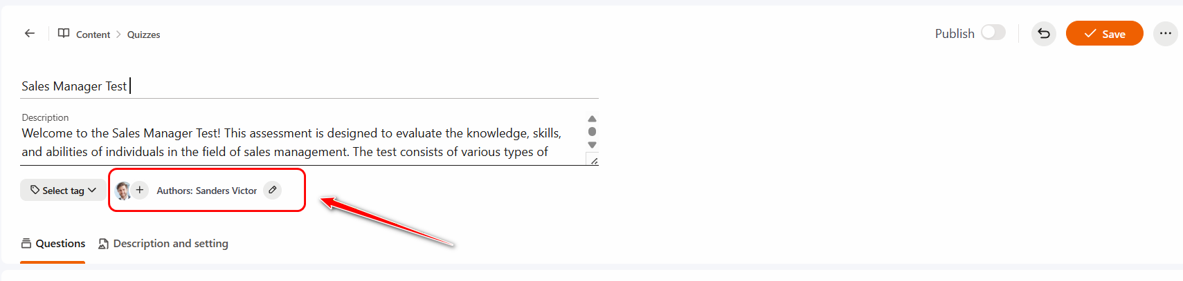 The user who creates a quiz is automatically assigned as its Author. The author has full management access: they can both edit and remove the quiz. If necessary, you can change the author or add one or more co-authors of the quiz, who will be able to edit the quiz but will not have the rights to remove it.