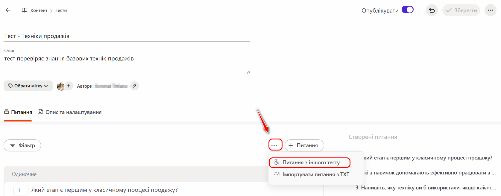 Щоб додати запитання з іншого тесту, натисніть кнопку Дії та виберіть опцію Питання з іншого тесту.
