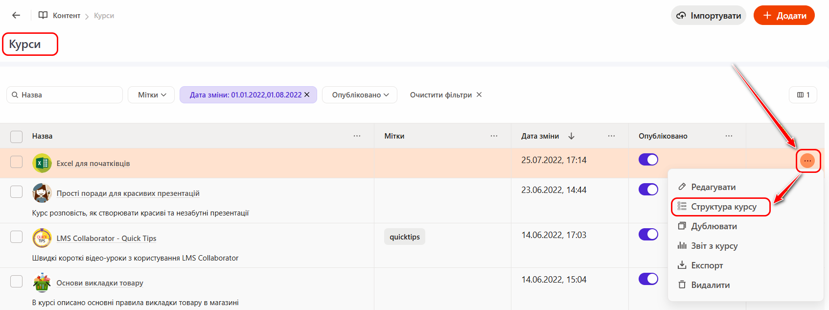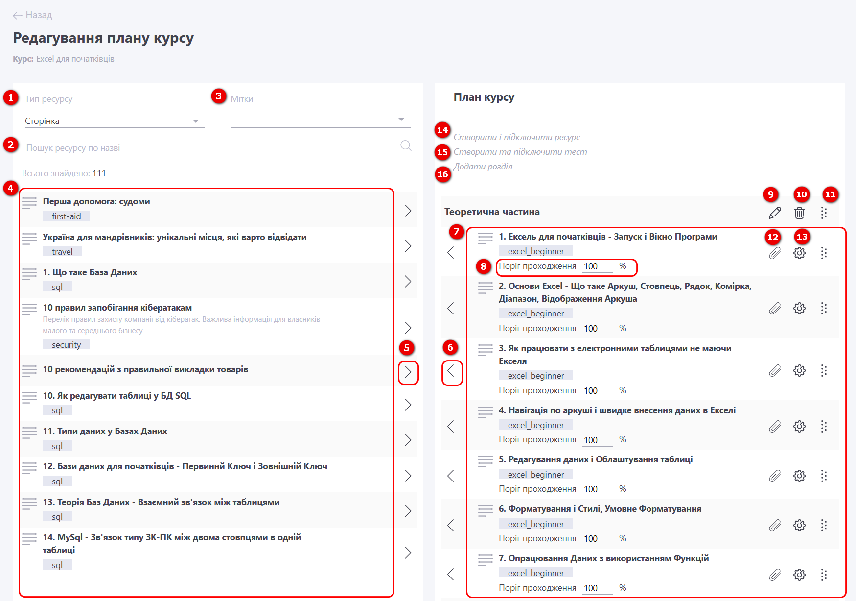 (7) - складений список Плану курсу - відображається назва, опис та мітки для доданих матеріалів курсу та інструменти керування для кожного елемента.