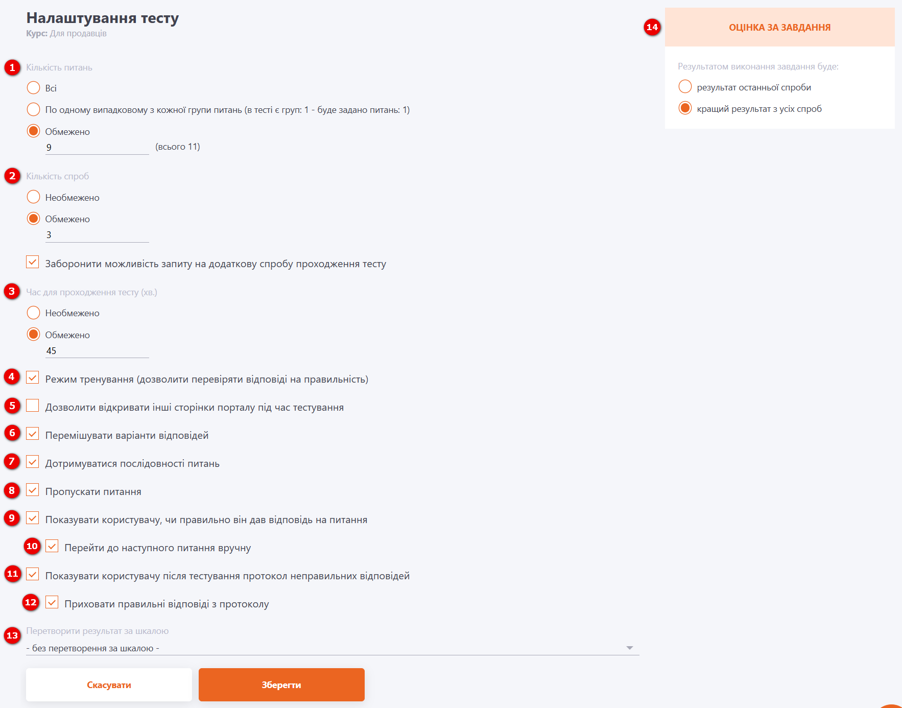 (13) - Перетворити результат за шкалою - можливість налаштувати перерахунок оцінки в % до потрібної шкали (наприклад, 5-бальна система, ECTS і т.д.). За замовчуванням усі завдання у системі оцінюються від 0 до 100%. Детальніше: Шкали оцінки завдань.