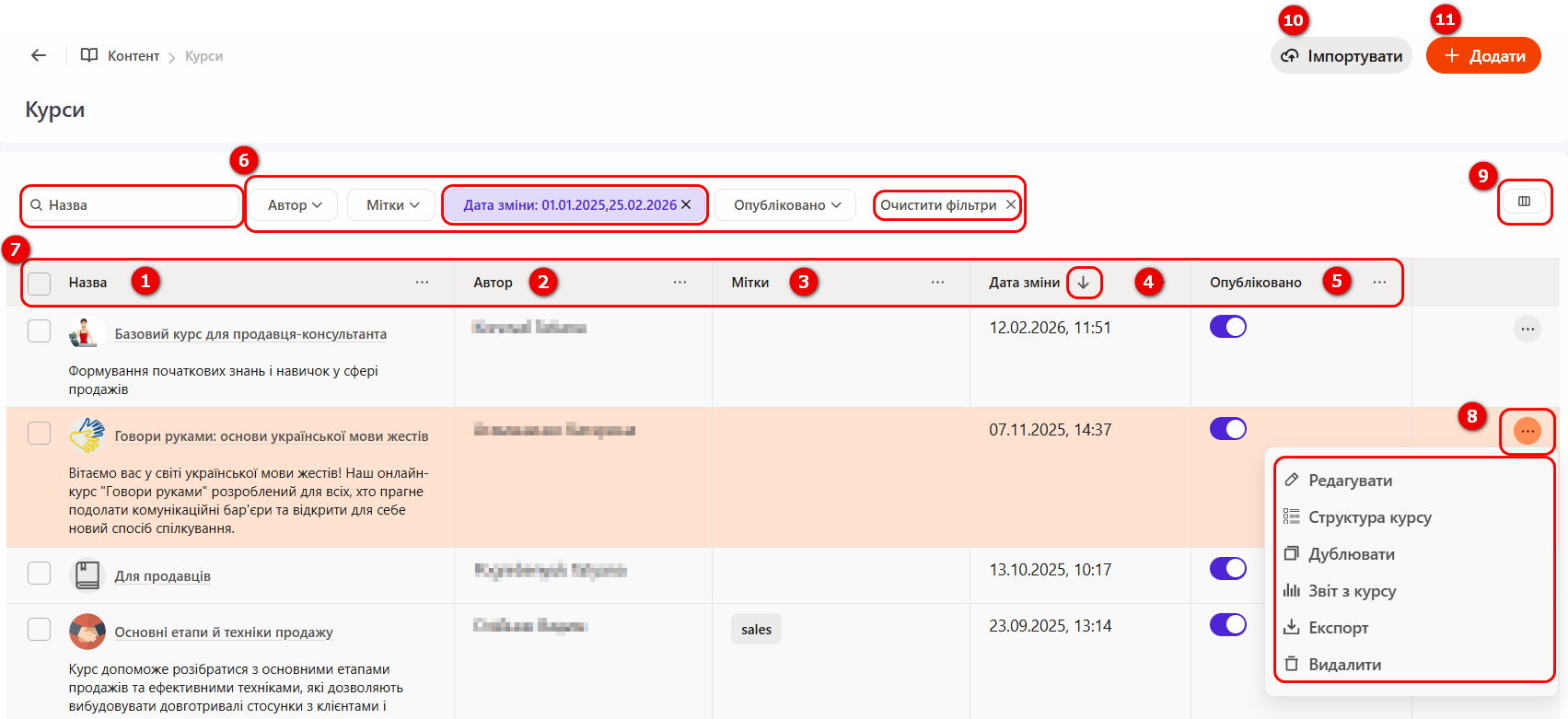 За полями (1)-(5) доступний пошук і сортування курсів.